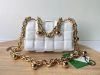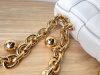 Woven by hand into an exaggerated, padded version of Bottega Veneta’s intrecciato weave, the Chain Cassette shoulder bag nods to the past while capturing the zeitgeist. The golden chain hardware is made with meticulous attention to detail; it’s polished to create the perfect surface finish before being galvanized and treated with hypoallergenic and protective coatings. This rendition from the Salon 02 collection features the addition of spherical embellishments.