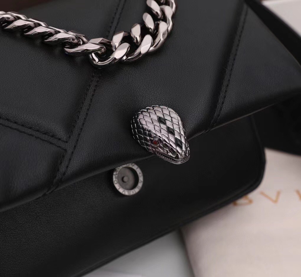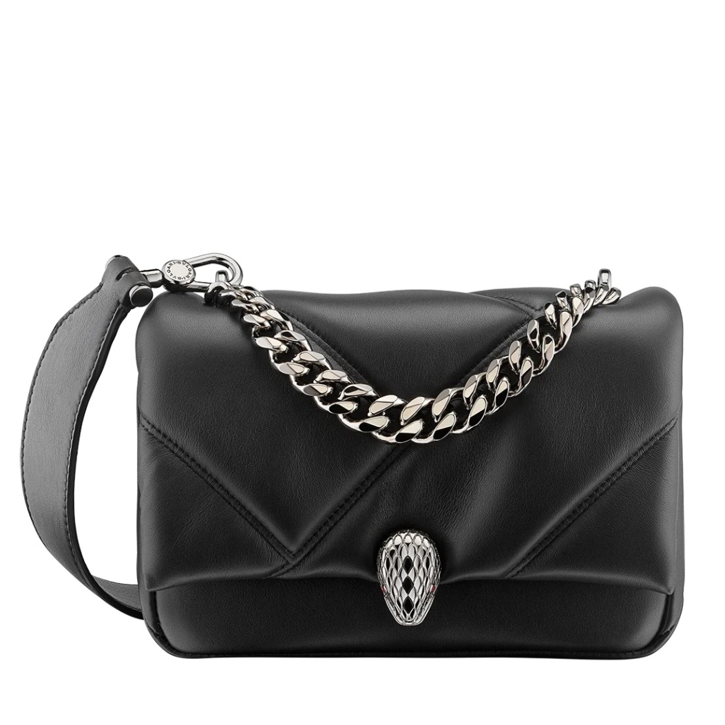 Made of a captivating combination between a maxi graphic motif and bold metal details, this “Serpenti Cabochon” mini crossbody bag is ready to hit the Serpenti universe with its sophisticated and functional design, featuring a contemporary style. The geometric maxi matelassé pattern, inspired by the sinuous surface of cabochon-cut gemstones, enhances the extreme softness of the calf leather of the bag’s core. The model is enhanced by a new ruthenium-plated version of the Serpenti head closure in dark brass, which takes inspiration from a Bvlgari heritage watch from the 1960s, with small black onyx scales in the middle and red enamel eyes.