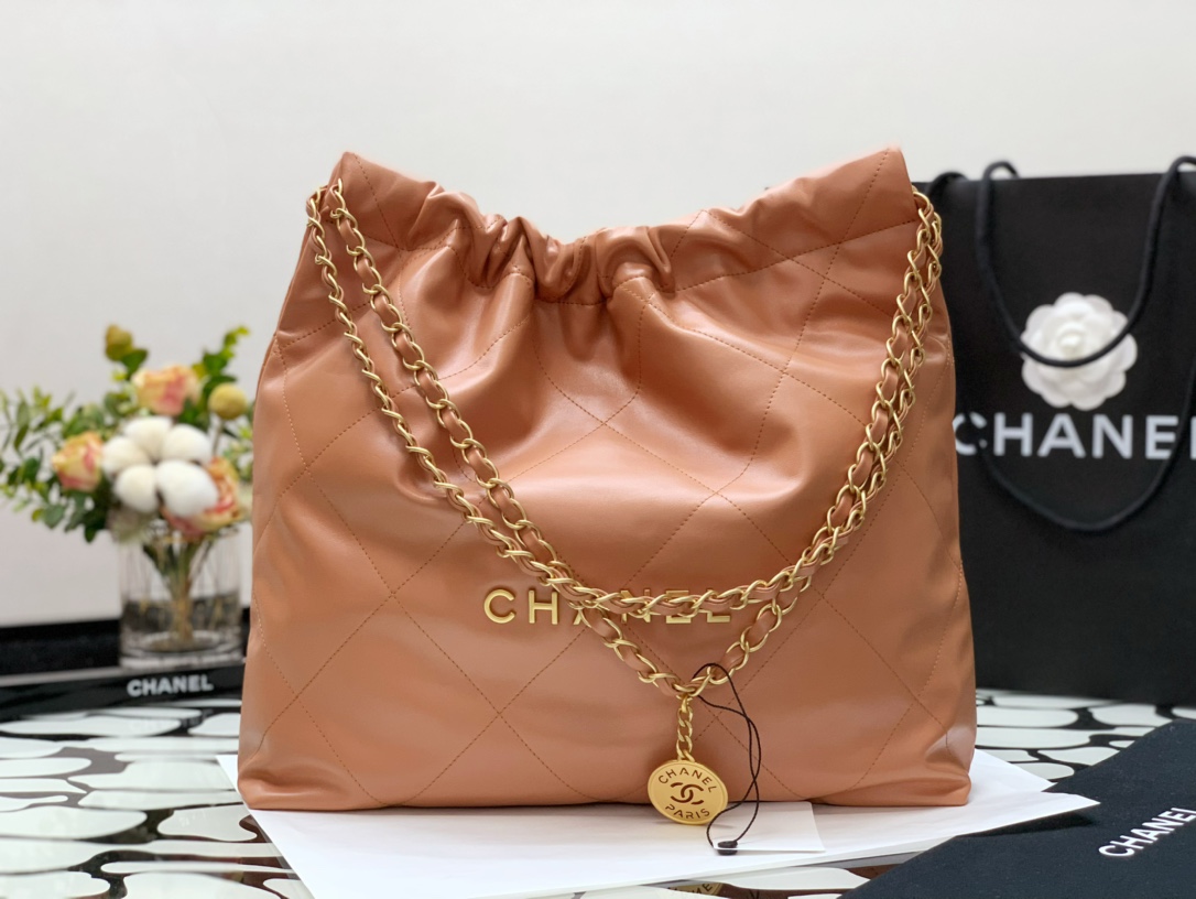 Chanel 22 Hanbag Khaki Calfskin With Gold-Tone Metal Medium 35cm