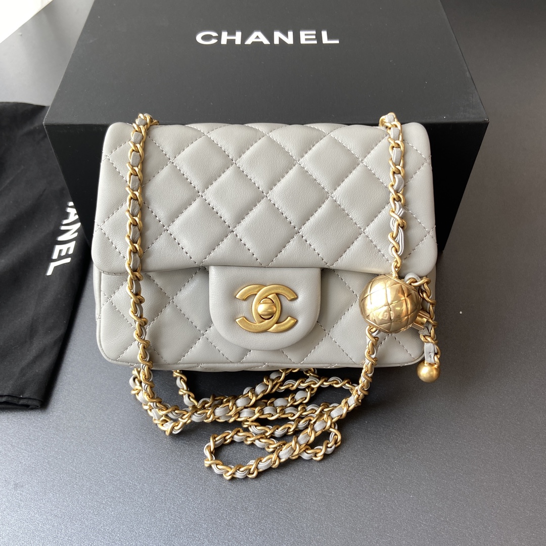 Chanel Mini Flap Bag with Aged Gold Hardware with Quilted CC Toggle Ball Gray