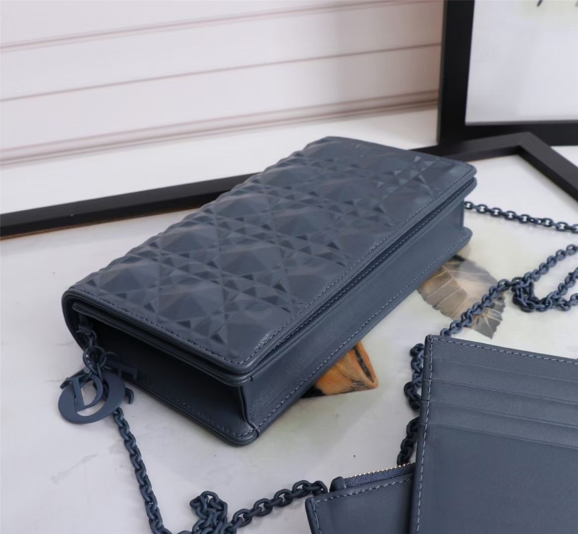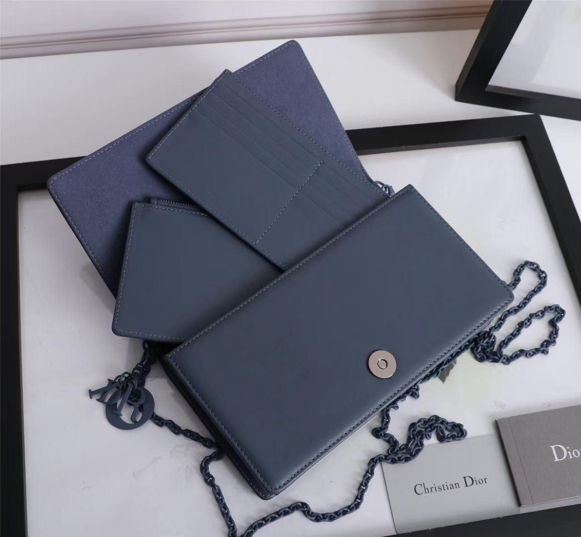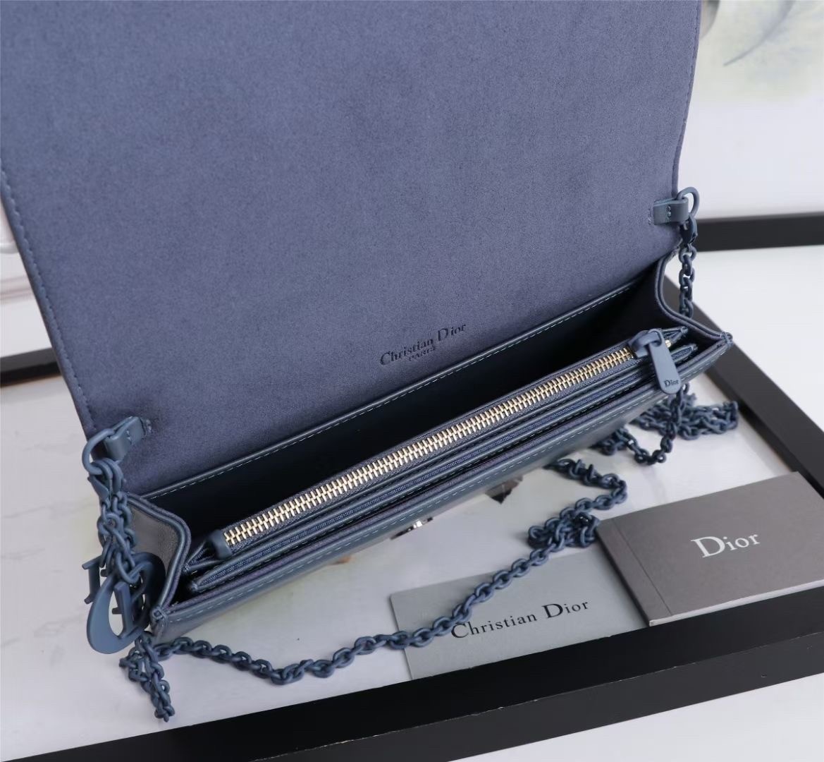The Lady Dior pouch, crafted in denim calfskin, is distinguished by a graphic interpretation of Cannage topstitching and a ‘D.I.O.R.’ charm in tonal matte metal. The unique accessory may be worn with or without its chain strap and features two removable elements, a card holder and a zipped pouch. Each may be carried individually. Boasting the House’s iconic motif, the pouch will instantly stand out and pairs effortlessly with other pieces from the same line.