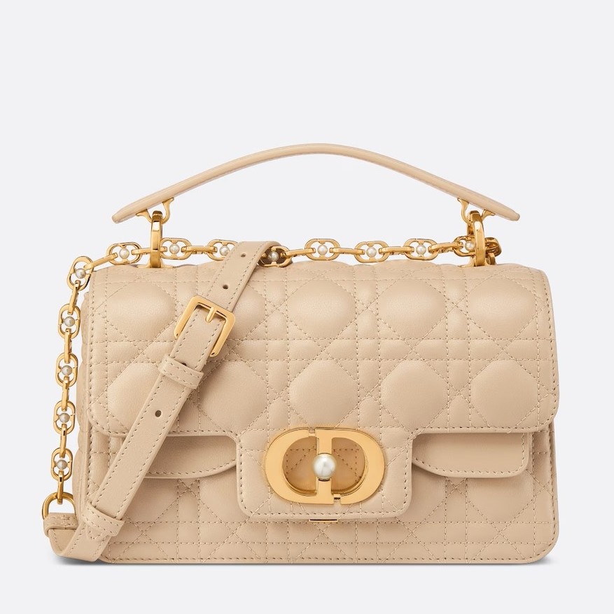 New for Summer 2024, the Dior Jolie Top Handle bag presents an elegant and functional design. It is crafted in calfskin with Cannage stitching and features a double flap enhanced by a CD signature embellished with a white resin pearl, as well as three compartments and a zip pocket to accommodate all the essentials, day or evening. The removable top handle is completed by a detachable chain strap with a leather insert and CD signature links embellished with white resin pearls, allowing the small bag to be comfortably carried by hand, worn over the shoulder or crossbody.