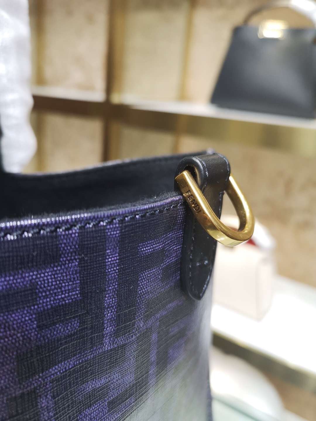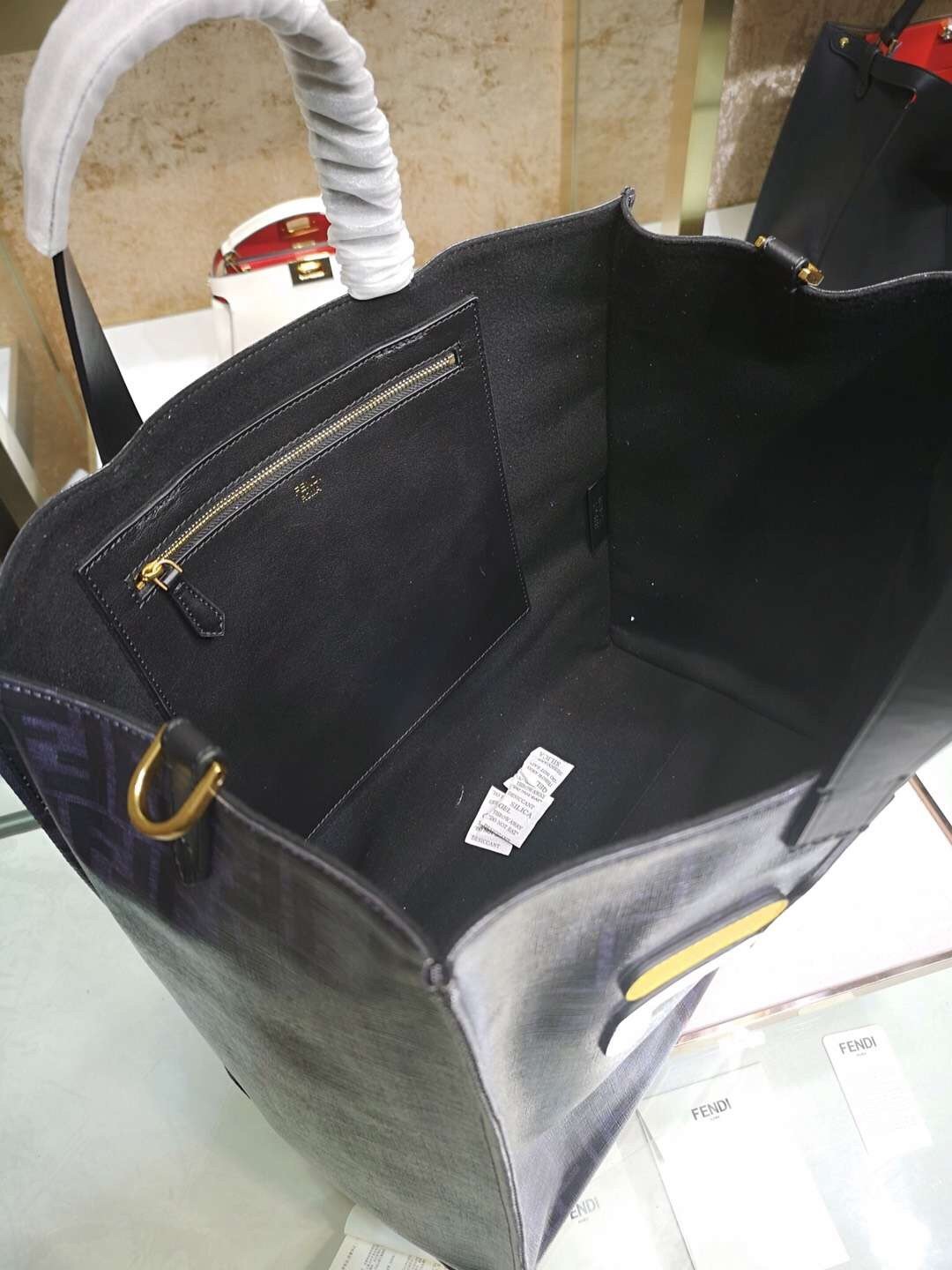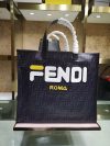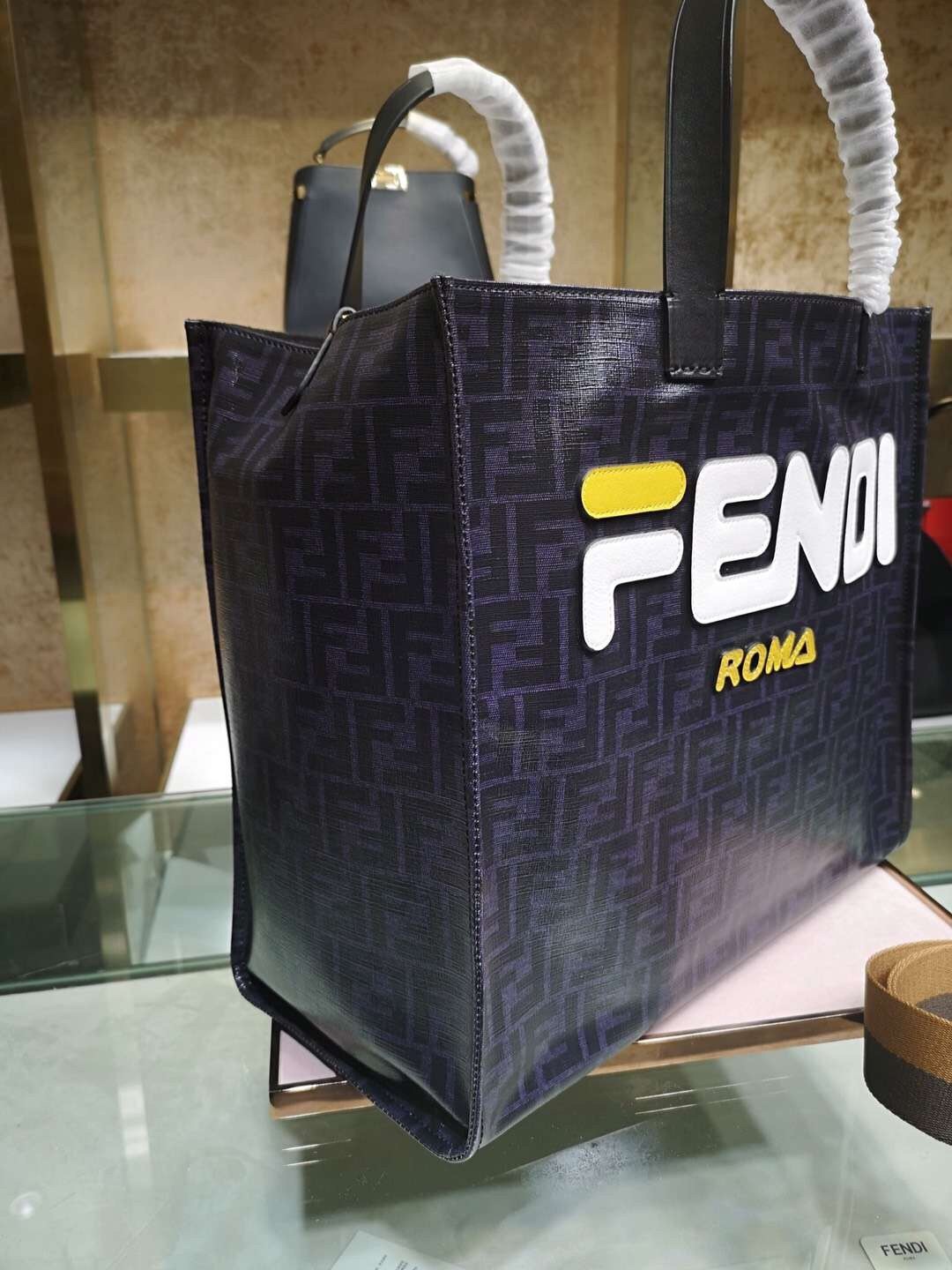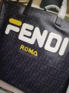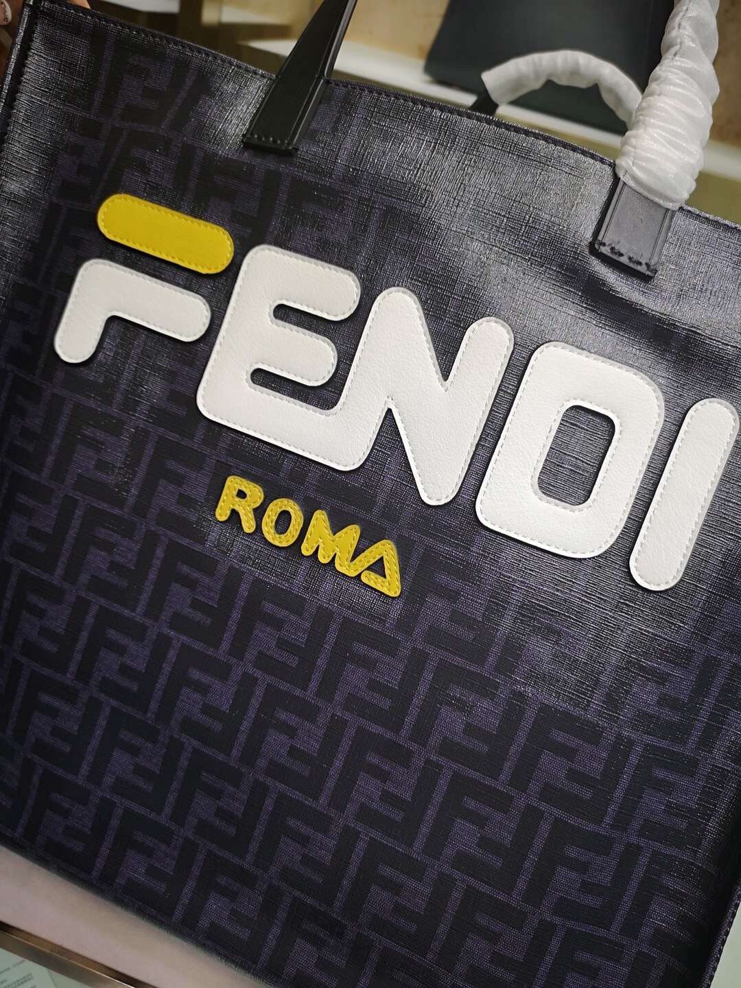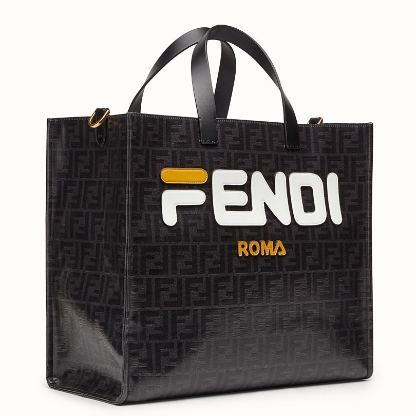 Fendi Schwarzer glasierter Stoff Shopper Weißes Logo Tasche