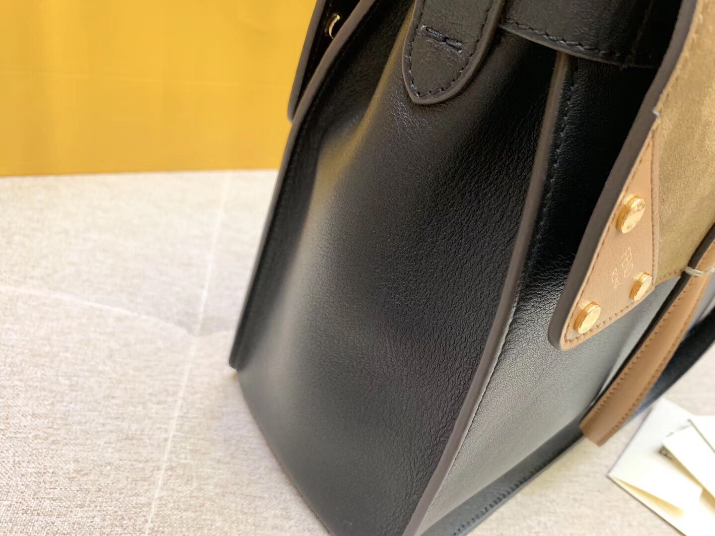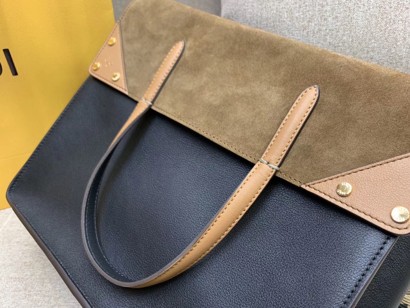 The Fendi Flip bag is part of Fendi’s Resort 2019 Collection and features a clever ??flip?? style that can be worn a couple of different ways. The bag has flaps on front and back that fold down to reveal contrasting suede design with micro flat studs. The Flip makes a work bag for you to stash your documents and even your laptop/tablet in, especially when you need to go for meetings.