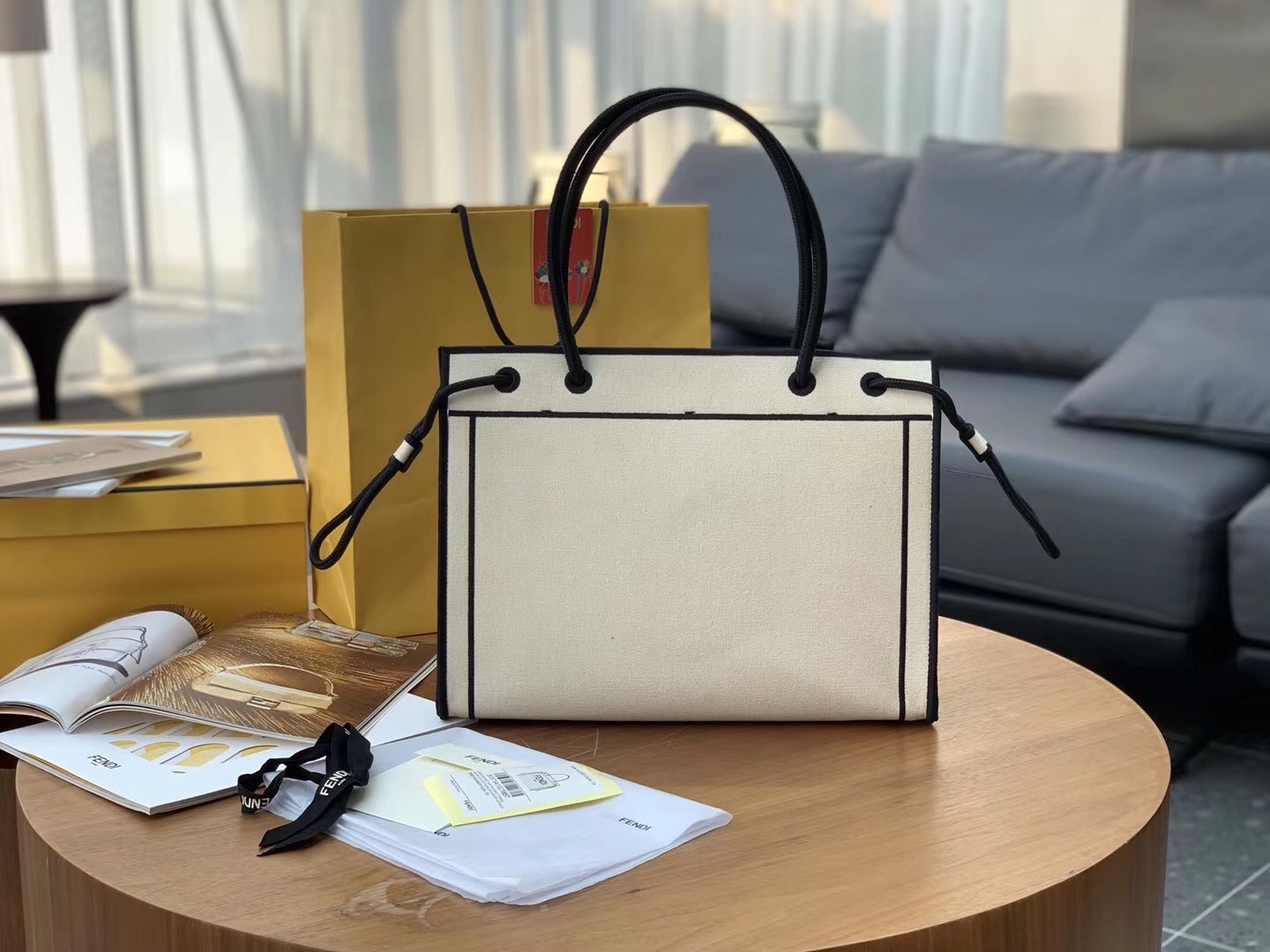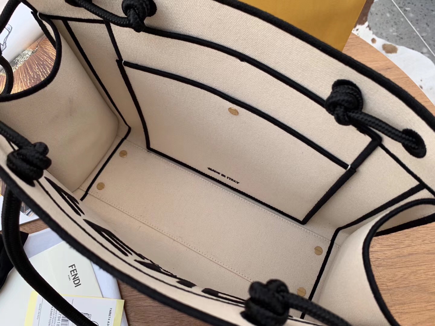 Fendi reimagines the Roma Shopper bag in a striking monochrome palette for Pre-AW20. This ivory canvas style is shaped with a flat base and clean-cut silhouette with black edges and an embroidered logo on the front, then opens to reveal an unlined interior with neat slip pockets. Carry it via the twin cord handles.
