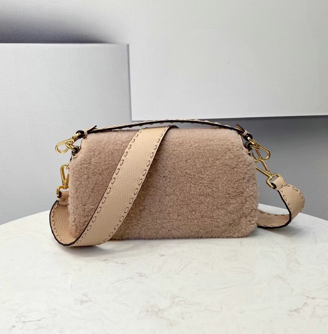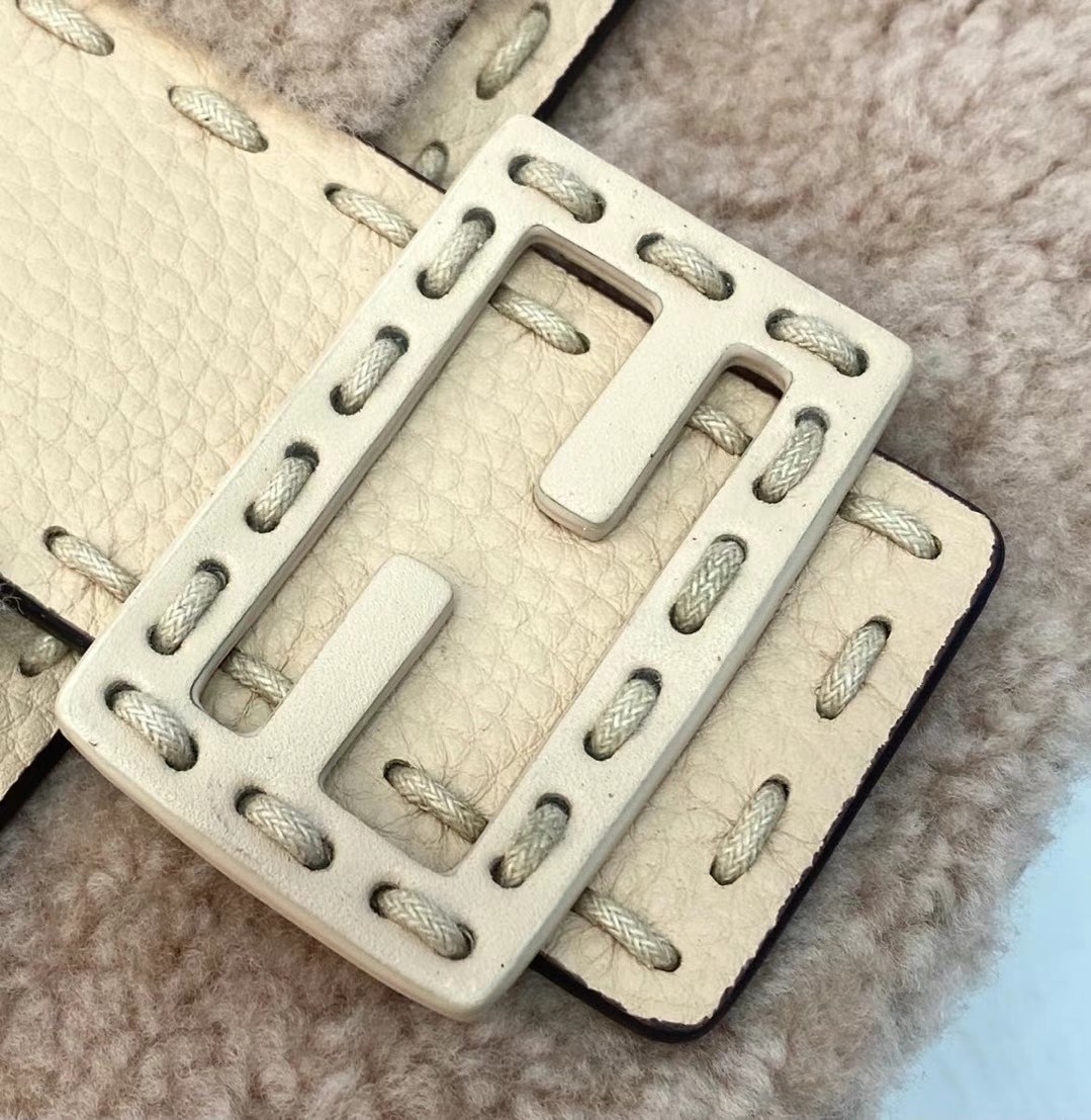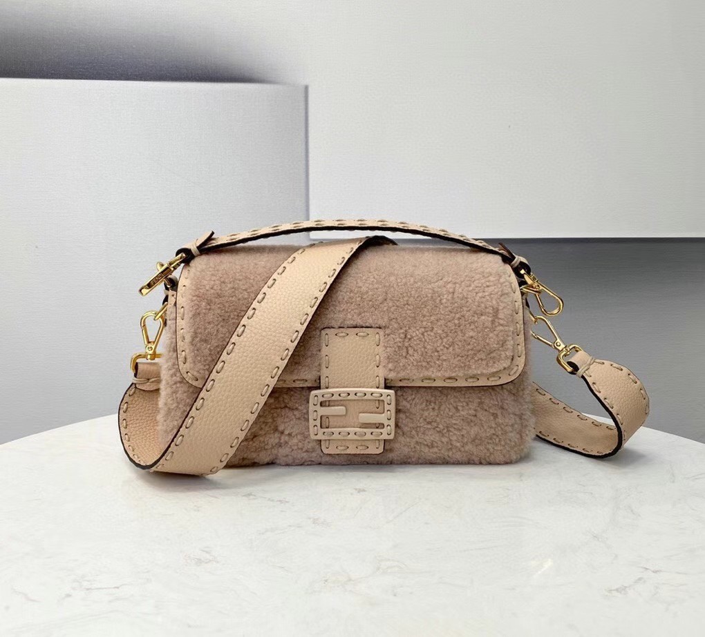 Iconic medium Baguette bag, made of soft merino sheepskin with oversized hand stitching and decorated with an FF clasp. Featuring a front flap, magnetic clasp, tone on tone leather trims, an internal compartment with a zipper pocket and gold-finish metalware. The bag can be carried by hand, or worn either on the shoulder or cross-body thanks to the handle and shoulder strap, both detachable.