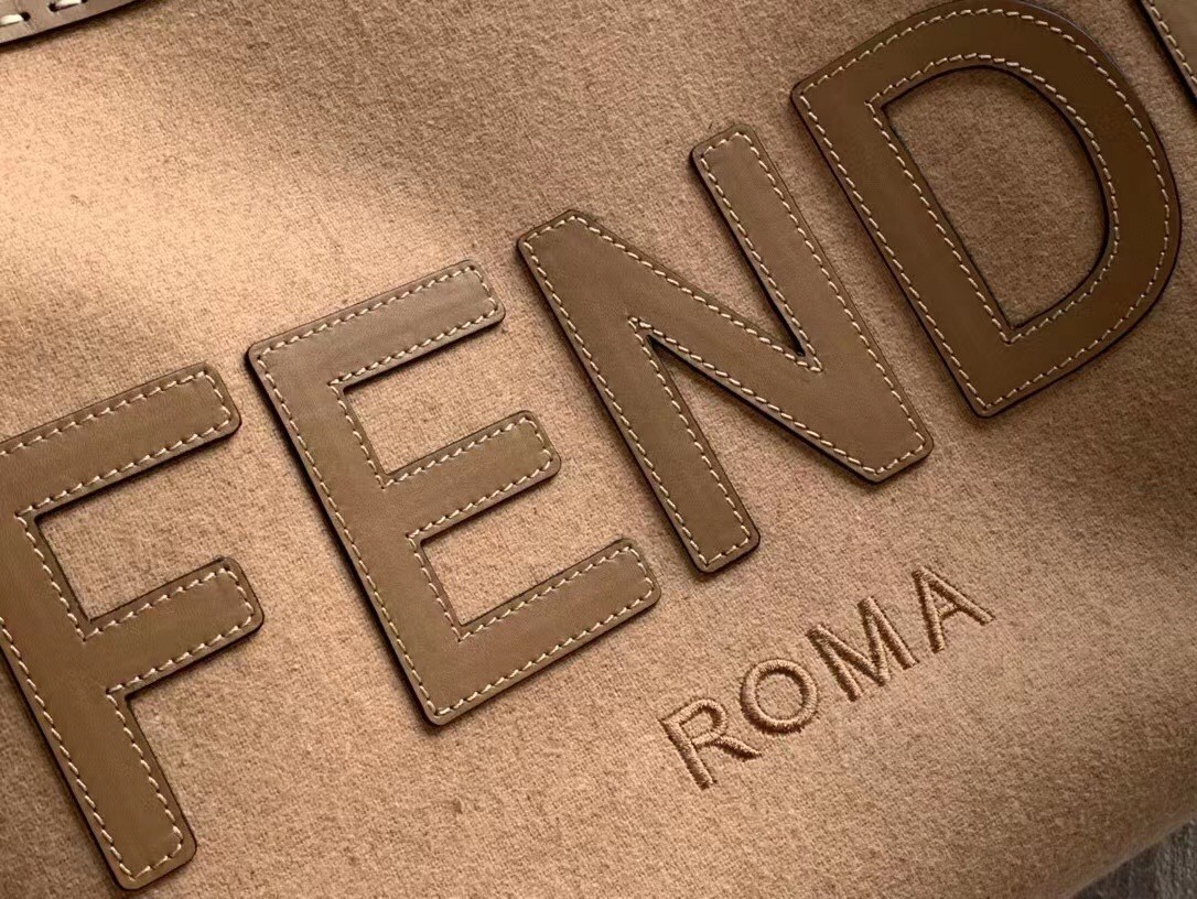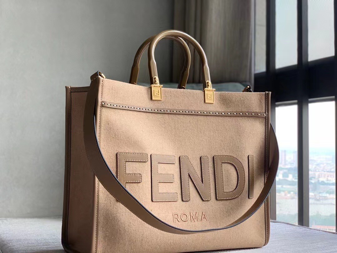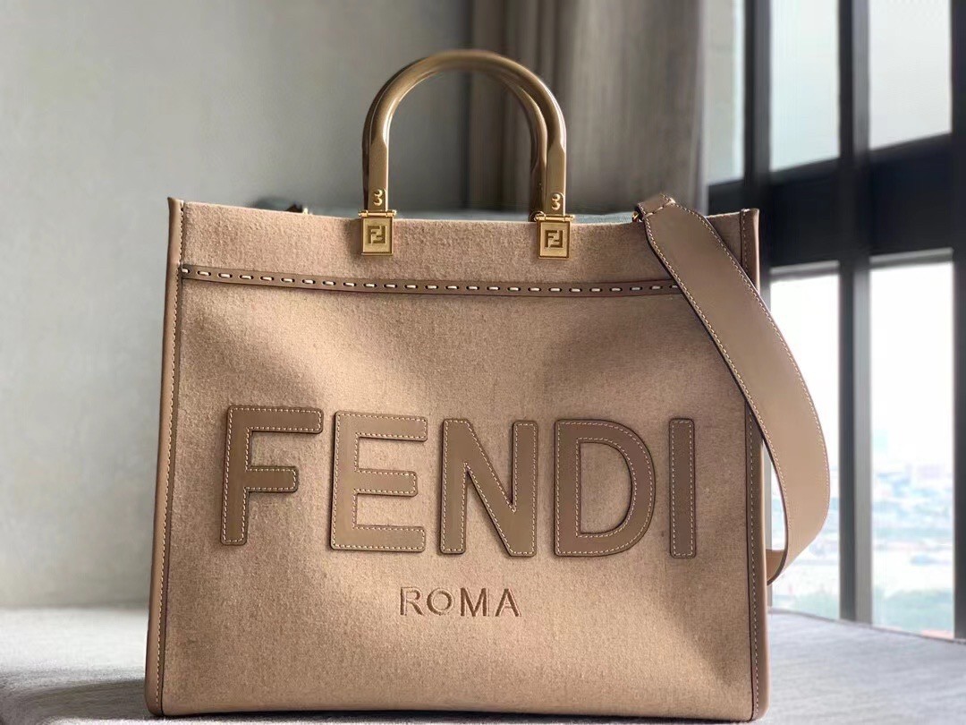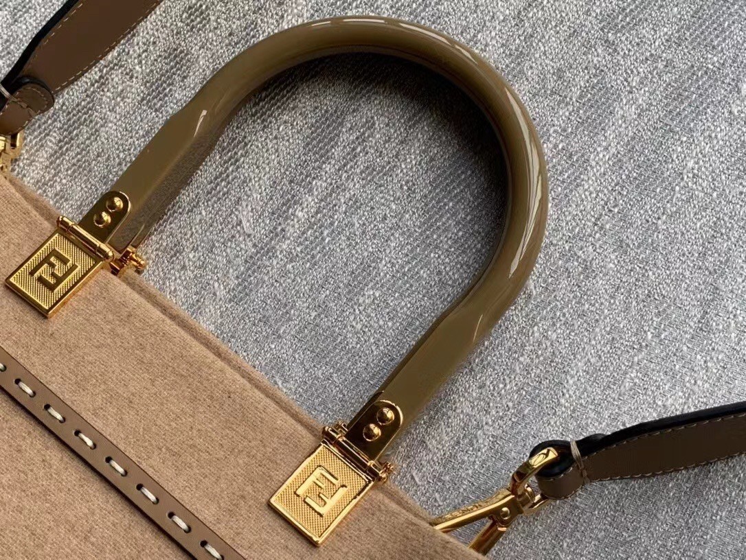 Medium Sunshine Shopper bag made of brown flannel with leather FENDI ROMA and stiff beige plexiglass handles. Features a spacious wool-lined internal compartment with FF motif, edges in tone on tone leather, and gold-finish metalware. Can be carried by hand or worn on the shoulder thanks to the two handles and detachable shoulder strap.