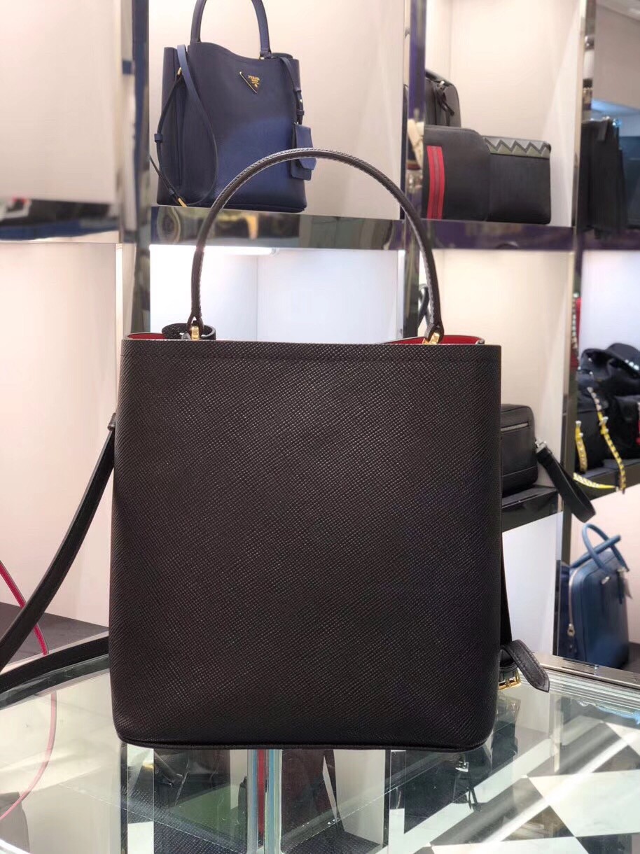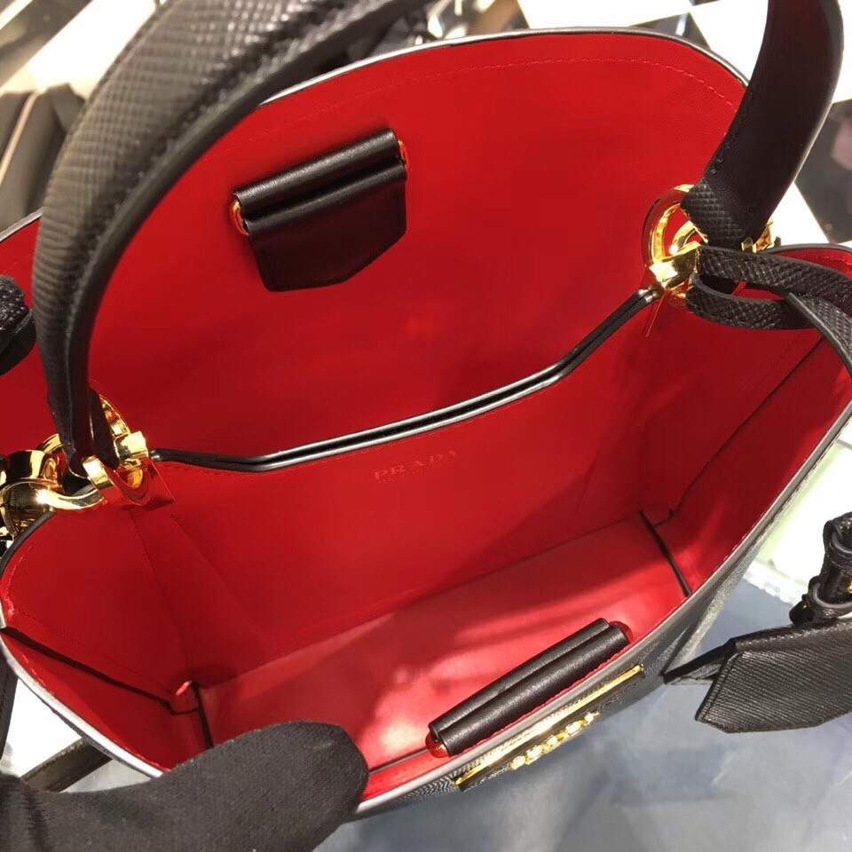 The Prada Double Bag is one of the house*s classics. But there is something exciting we need to share and it*s new. The Prada North South Double Bag, take a look at the shape, It looks very cute and it can be carried on the shoulder, crossbody or simply tote it from day to night thanks to the leather handles.