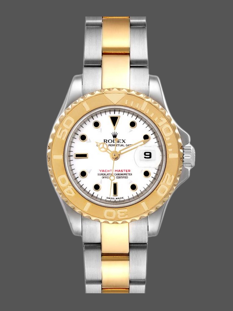 Rolex Yacht-Master 169623 Steel Yellow Gold White Dial 29MM Lady Replica Watch Stainless steel and yellow gold case 29 mm in diameter.Yellow gold special time-lapse bidirectional rotating bezel. Scratch resistant sapphire crystal with cyclops magnifier. White dial with luminova baton, triangular and round hour markers. Date calendar at 3 o’clock aperture. Stainless steel and yellow gold oyster bracelet with flip-lock clasp.