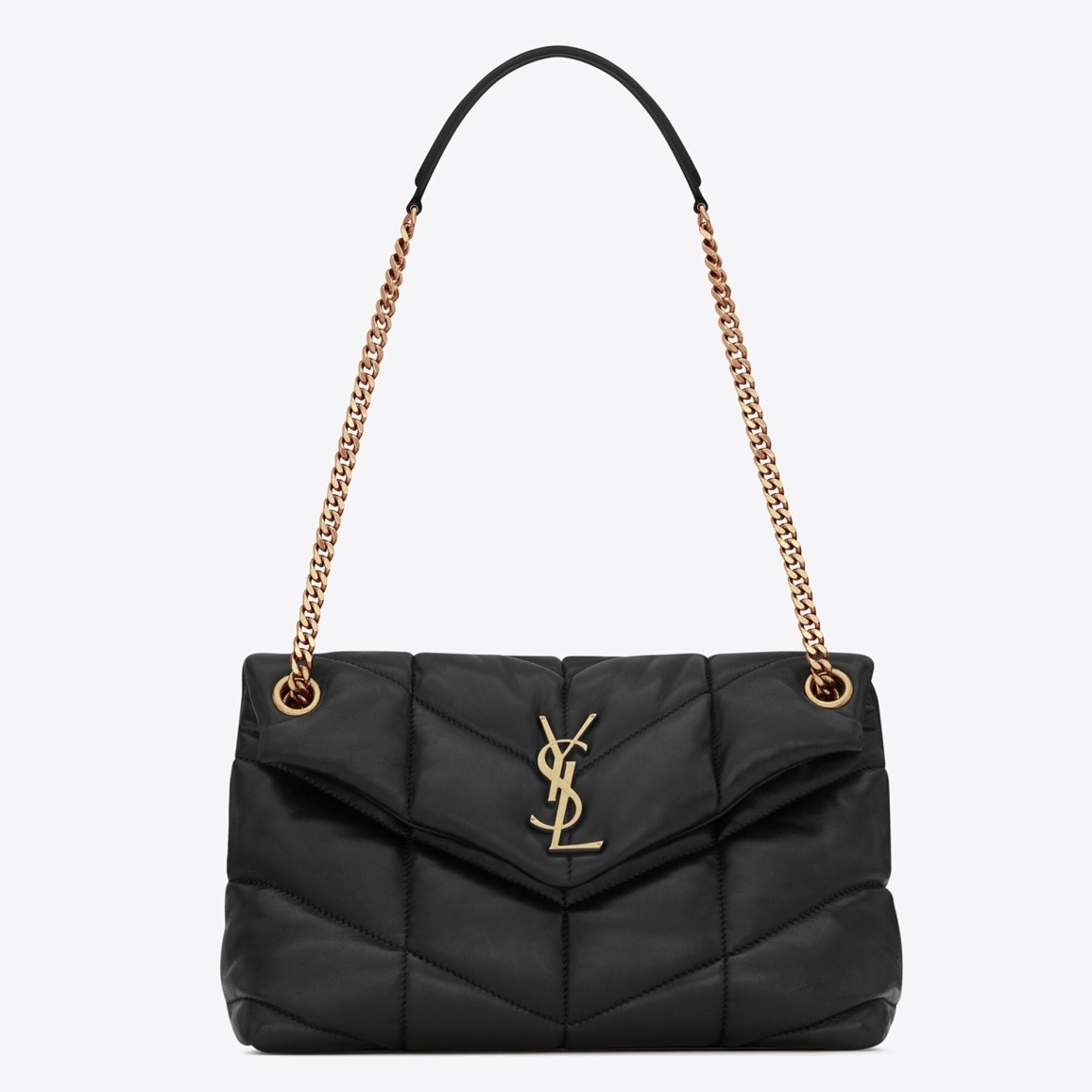 Saint Laurent’s Loulou Puffer Small shoulder bag is adorned with the label’s iconic YSL monogram for instant recognition. Crafted from supple lamb leather, this piece has a pillowy quilted finish and a practical magnetic fastening. Match your jewelry to its bronze-tone hardware.