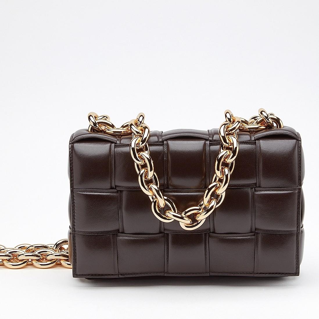 Daniel Lee takes Bottega Veneta’s signature intrecciato weave and reworks it again – this time using padded strips of leather to create a puffy silhouette. This ‘Cassette’ shoulder bag unlocks to reveal a spacious interior with a zipped pocket. Match any jewelry to the chunky gold chain strap, which happens to be another new addition for Pre-Fall ’20.