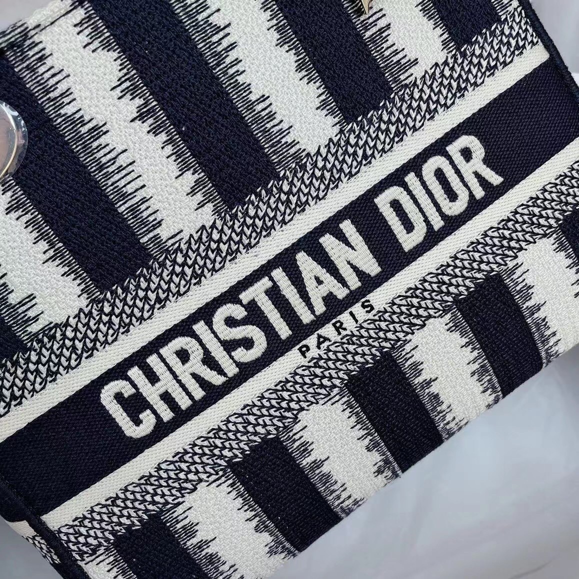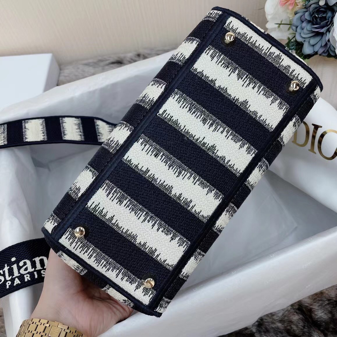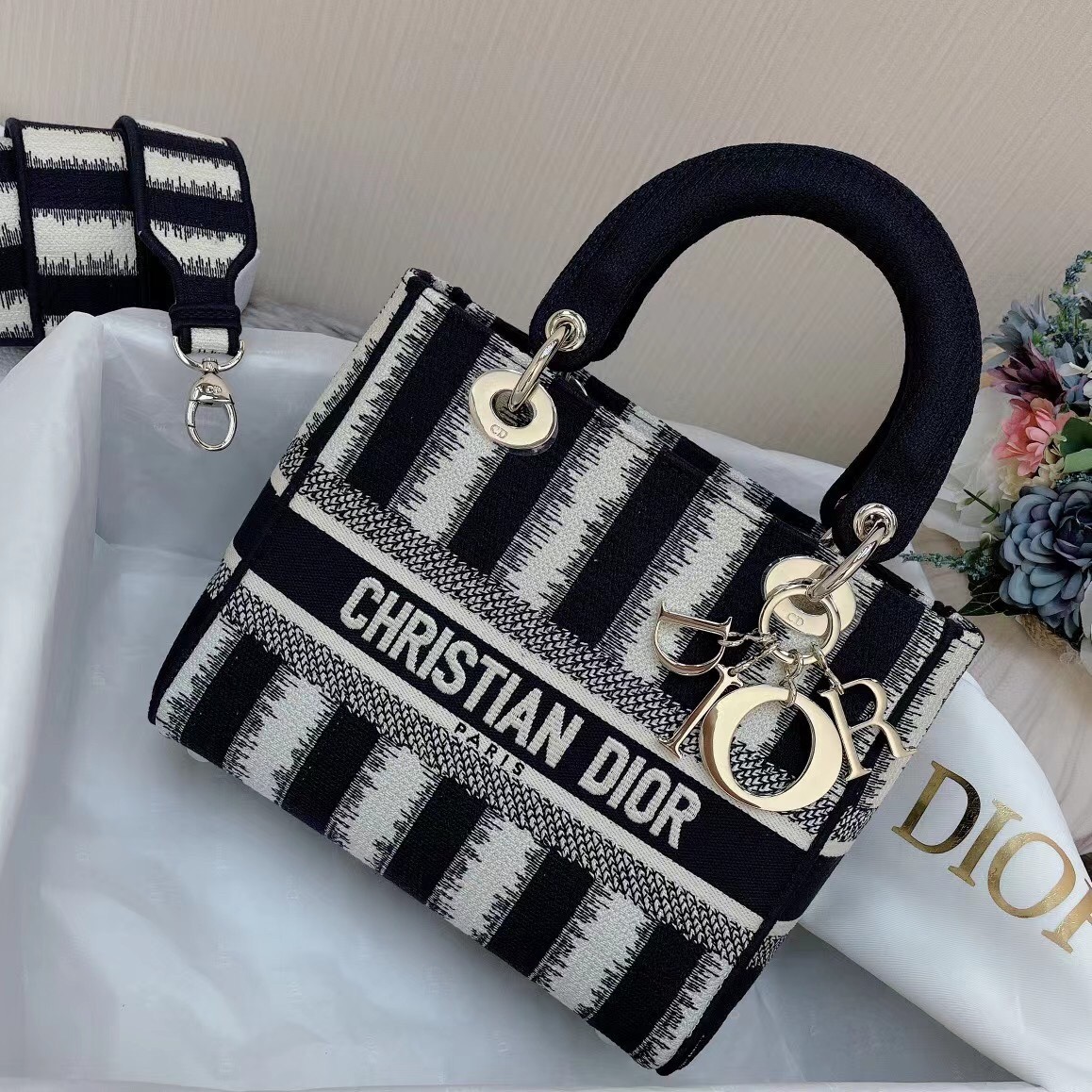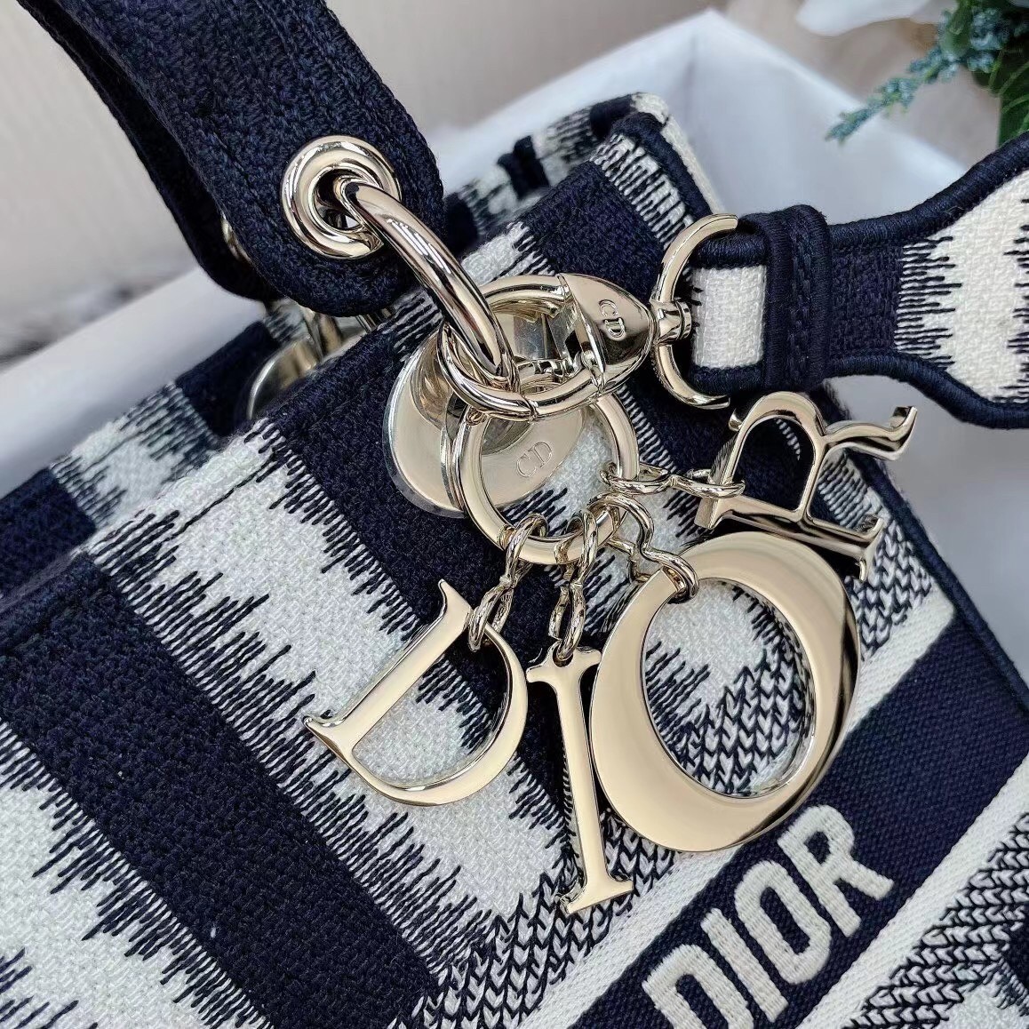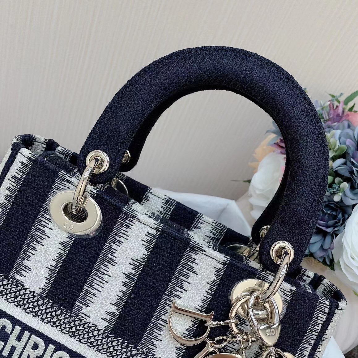 The Lady D-Lite bag combines classic elegance with House modernity. The design offers a new take on the bayad??re motif, with a modern variation fully embroidered with the blue heathered-effect D-Stripes motif. The front boasts a ‘Christian Dior’ signature while the thick ‘D.I.O.R.’ charms in pale gold-finish metal embellish the style with a graphic touch. Equipped with a wide, reversible, and removable embroidered shoulder strap, the medium Lady D-Lite bag can be carried by hand, worn over the shoulder or crossbody