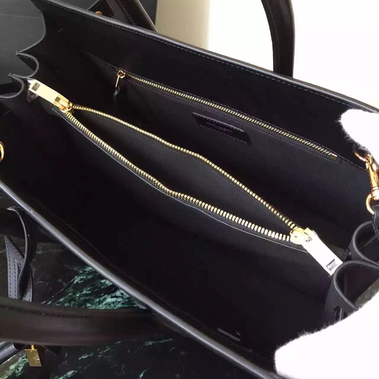 – Interior central zip compartment. 2 slot pockets. 1 zip pocket and key ring with padlock keys affixed to interior with a snap