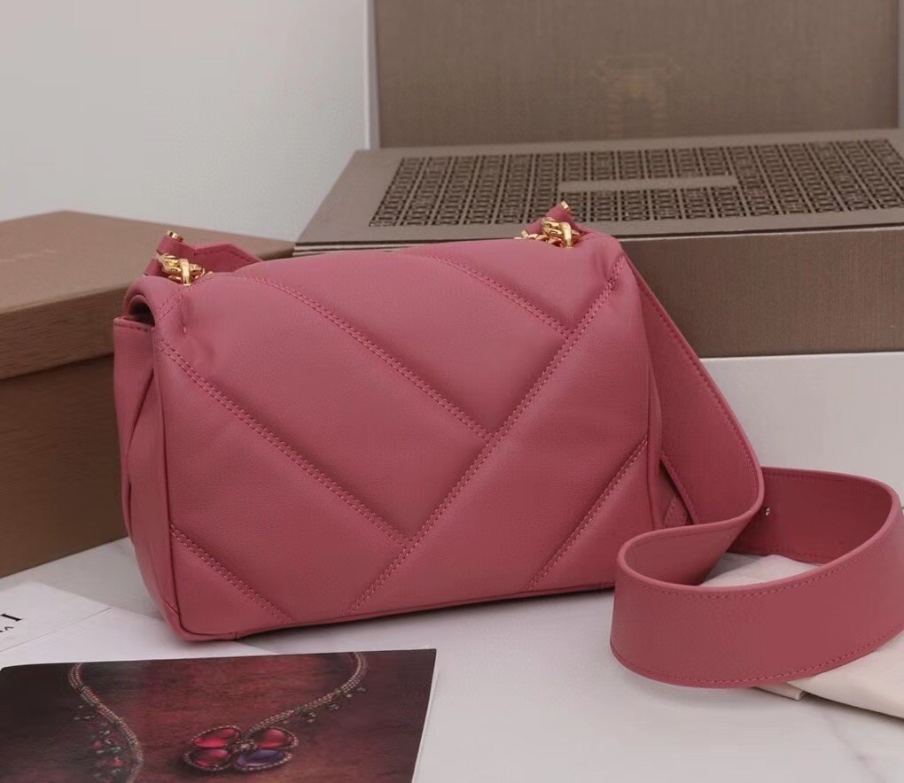 Made of a captivating combination between a large graphic motif and bold metal details, this “Serpenti Cabochon” crossbody bag is ready to enlarge the Serpenti universe with its sophisticated and functional design, featuring a contemporary style. The geometric maxi matelassé pattern, inspired by the sinuous surface of cabochon-cut gemstones, enhances the extreme softness of the calf leather of the bag’s core. The model is enriched with a new interpretation of the Serpenti head closure in gold-plated brass, taking inspiration from a Bvlgari heritage watch from the 1960s, with small pink mother-of-pearl scales in the middle and red enamel eyes.