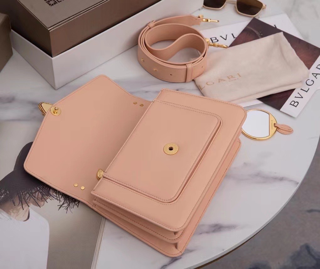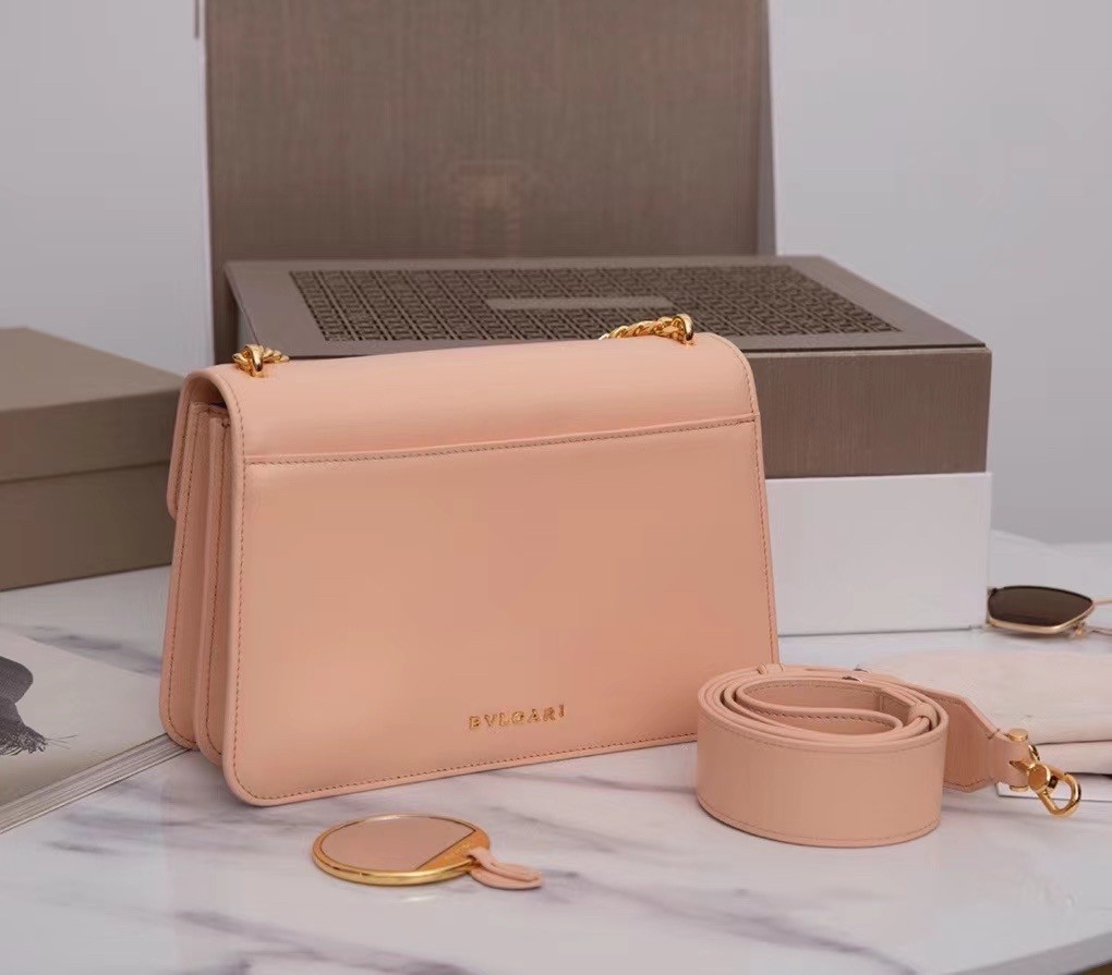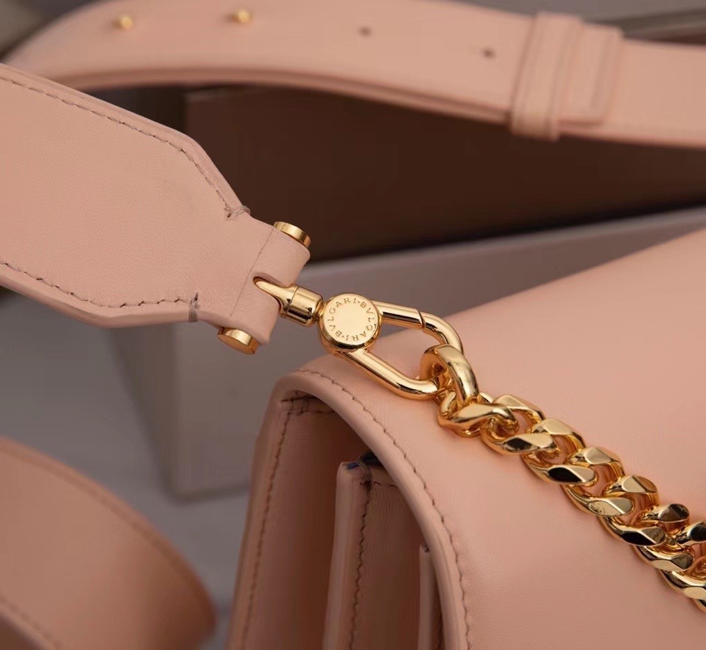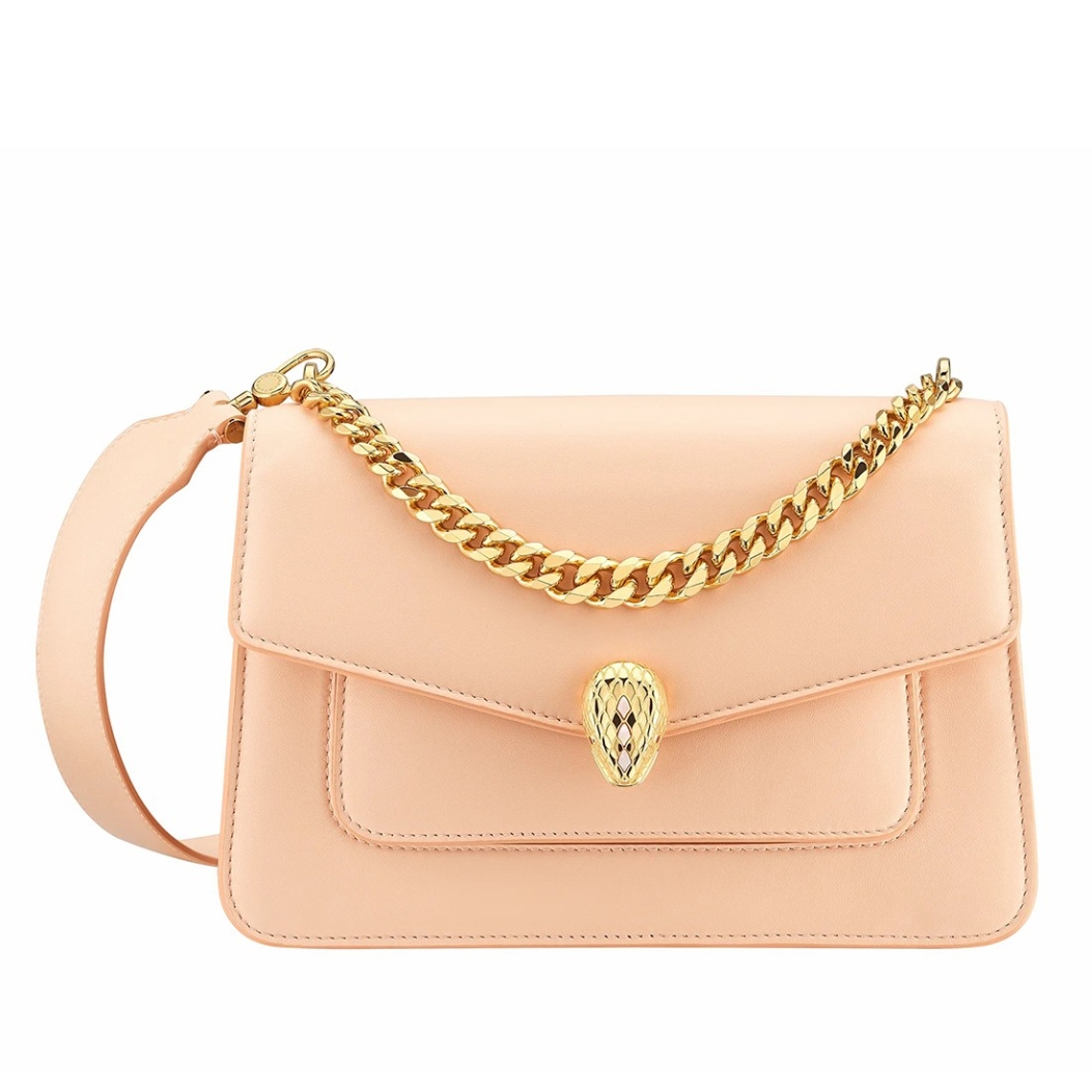 The “Serpenti Forever” family welcomes a new corssbody bag featuring a more contemporary shape and daily attitude. Crafted in soft nappa leather, this maxi chain bag features gold plated brass hardware. The model is enriched with a new interpretation of the Serpenti head closure in gold plated brass, taking inspiration from a Bvlgari heritage watch from the 1960s, with small pink mother-of-pearl scales in the middle and red enamel eyes. Recalling the jeweller DNA, an iconic Bvlgari chain adorns the flap like a collier, also suitable as a refined handle.