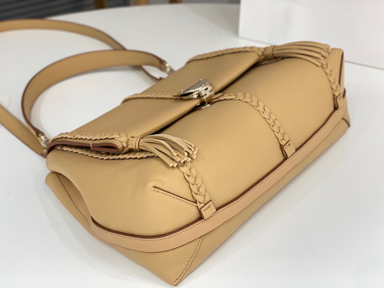 Chloé’s Penelope medium shoulder bag perfectly encapsulates the label’s bohemian charm. Crafted from naturally grained calfskin, it has a fold-over shape traced with braiding and swishy tassels. It comes with two handles – it’s easy to attach the one you want using the gold clasps.