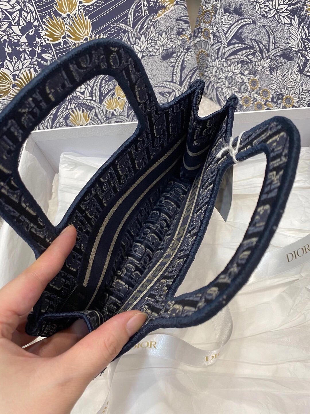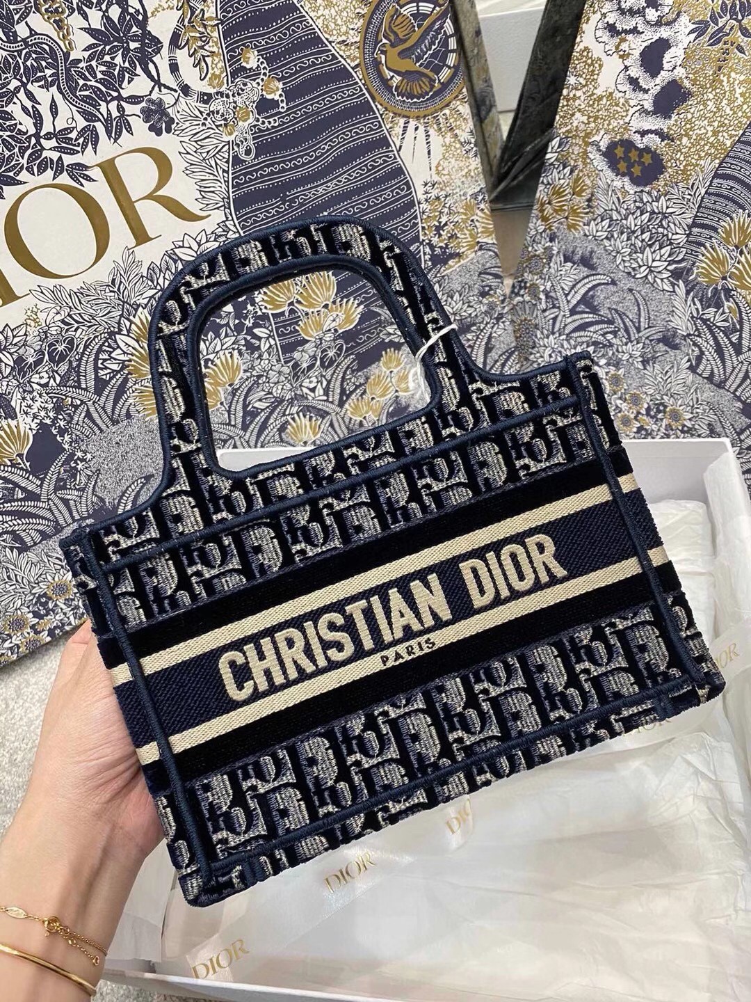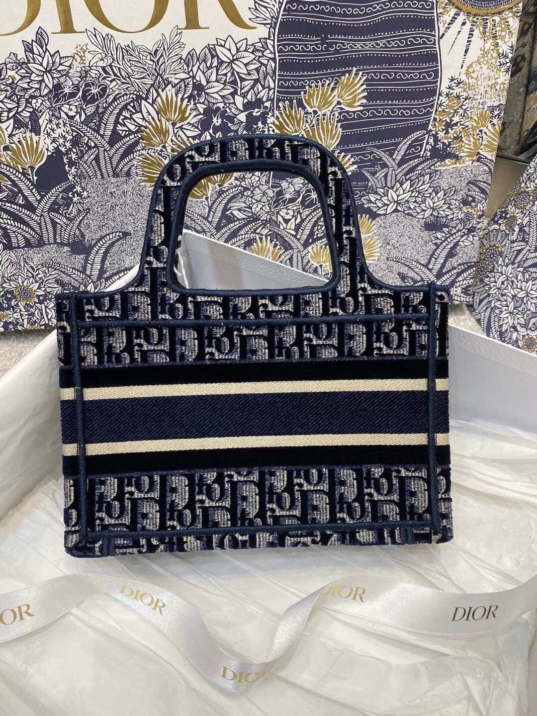 Dior Mini Book Tote Bag In Blue Dior Oblique Embroidered Velvet
