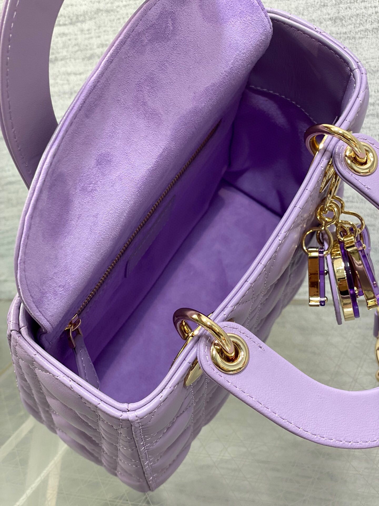 Petit sac Lady Dior en cuir d'agneau lilas avec breloques en résine