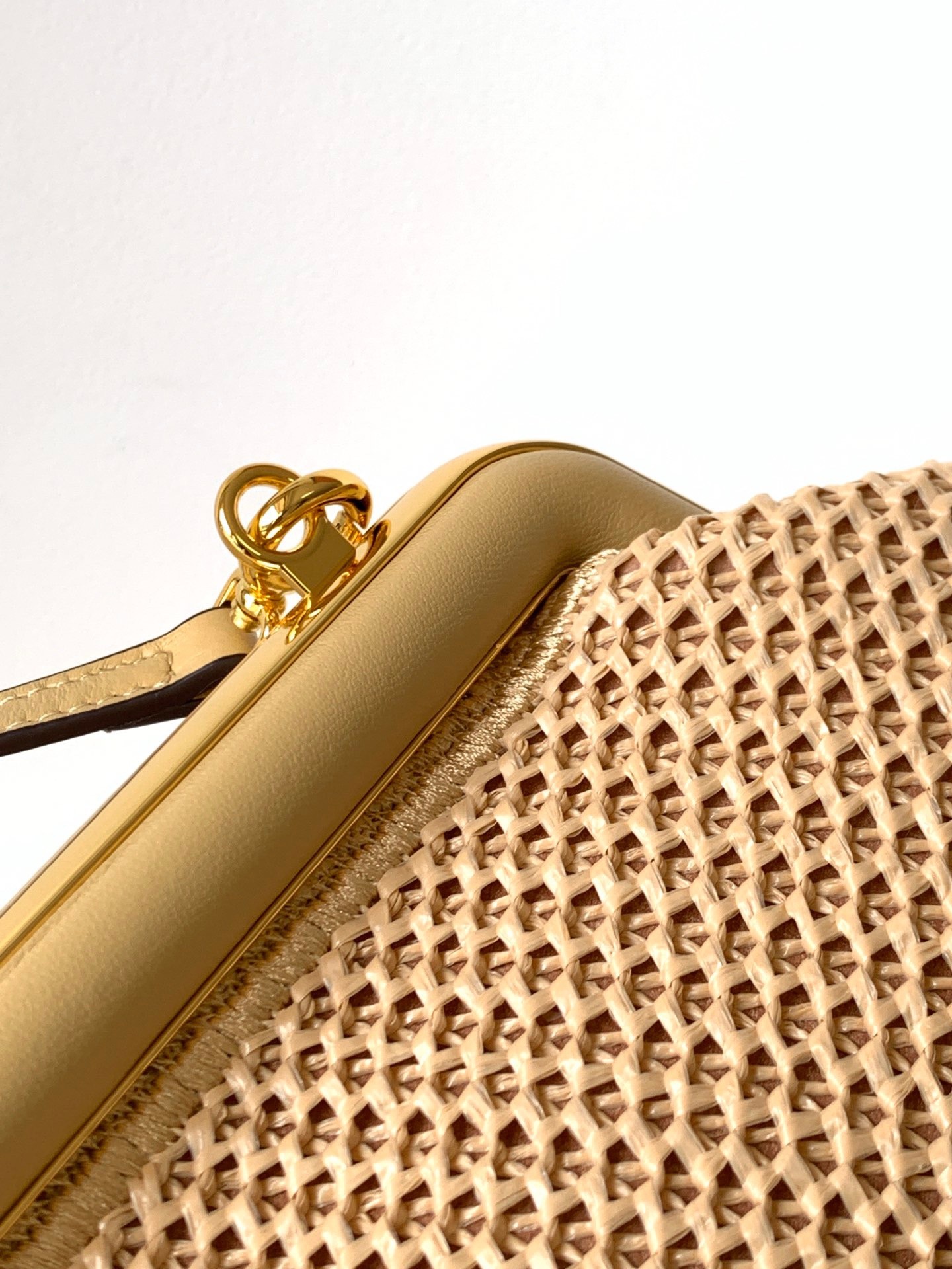 – Oversized metal F clasp bound with beige nappa leather