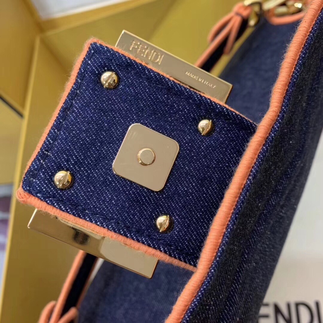 Iconic Baguette bag in large size, with flap and FF fastening with magnetic clasp. Lining with zip pocket. Can be carried by hand or worn cross-body thanks to its handle and shoulder strap, both detachable. Made of dark blue cotton denim, edges embroidered in red satin stitch. Long shoulder strap customized with Fendi Label embroidery. Gold-finish metalware.