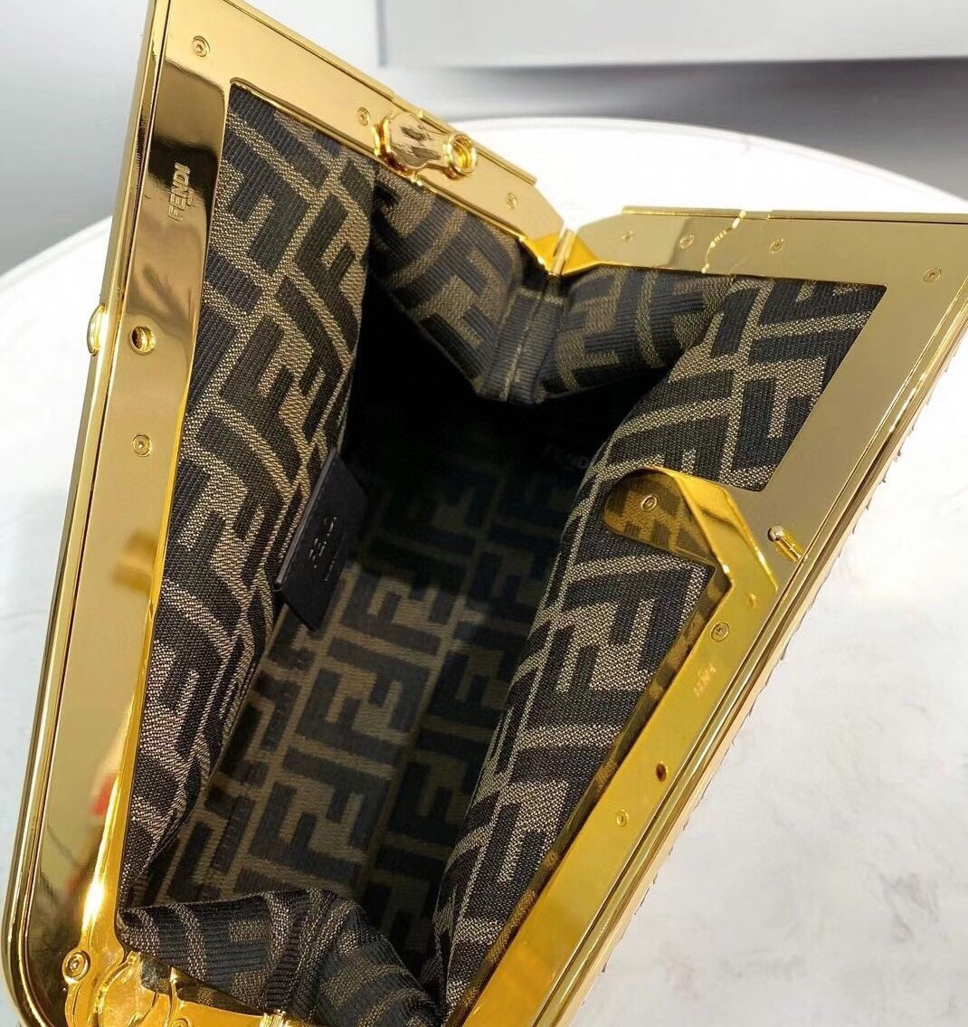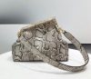 Medium Fendi First bag made of exquisite natural python leather. Decorated with an F-shaped snap clasp covered in tone on tone python leather. Featuring an internal compartment with an iconic FF motif fabric lining and gold-finish metalware. The bag can be carried by hand as a clutch, or worn on the shoulder thanks to the adjustable, detachable python leather shoulder strap.