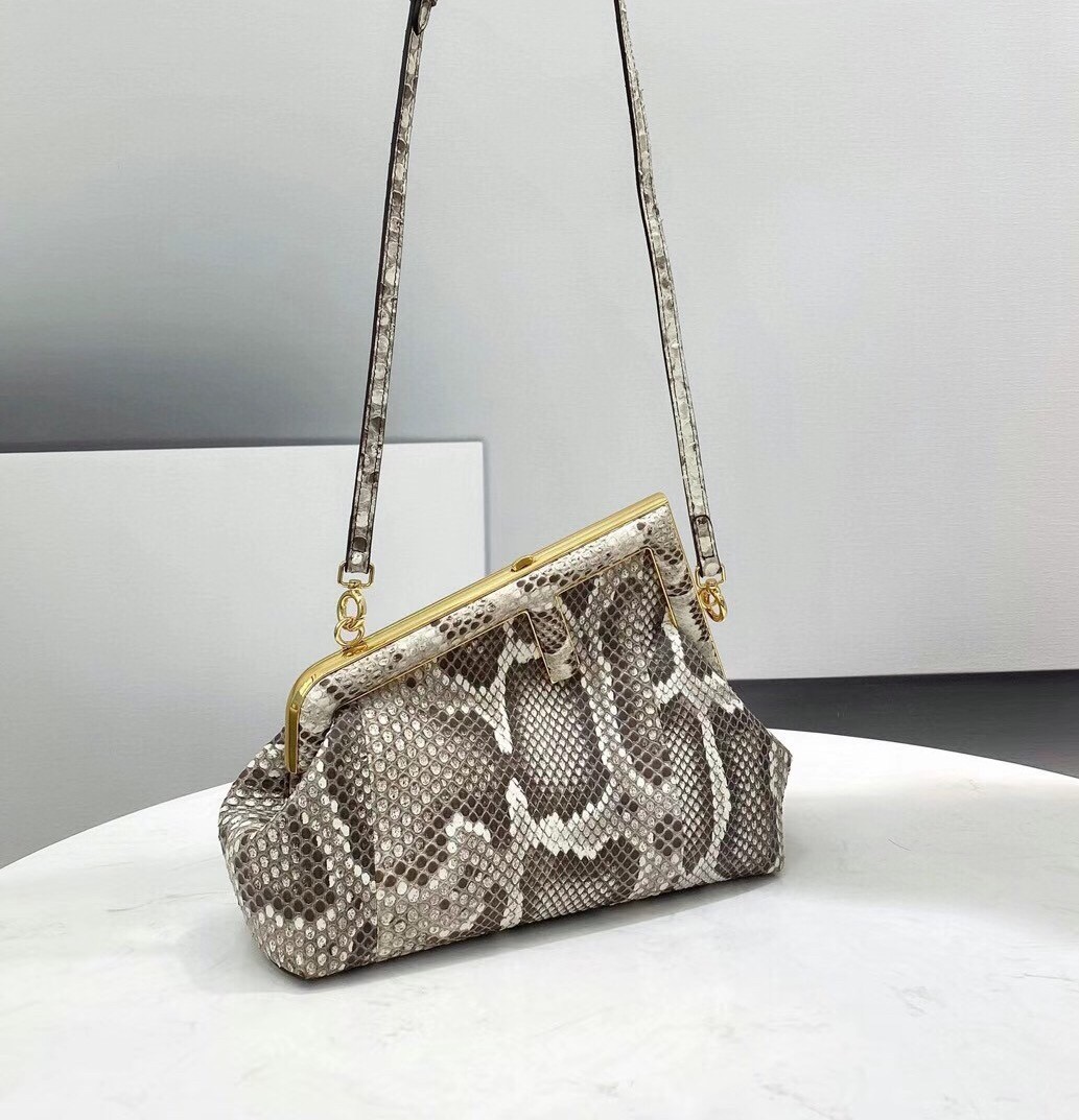 Small Fendi First bag made of exquisite, natural python leather. Decorated with an F-shaped snap clasp covered in tone on tone python leather. Featuring an internal compartment with an iconic FF motif fabric lining and gold-finish metalware. The bag can be carried by hand as a clutch, or worn on the shoulder thanks to the adjustable, detachable python leather shoulder strap.