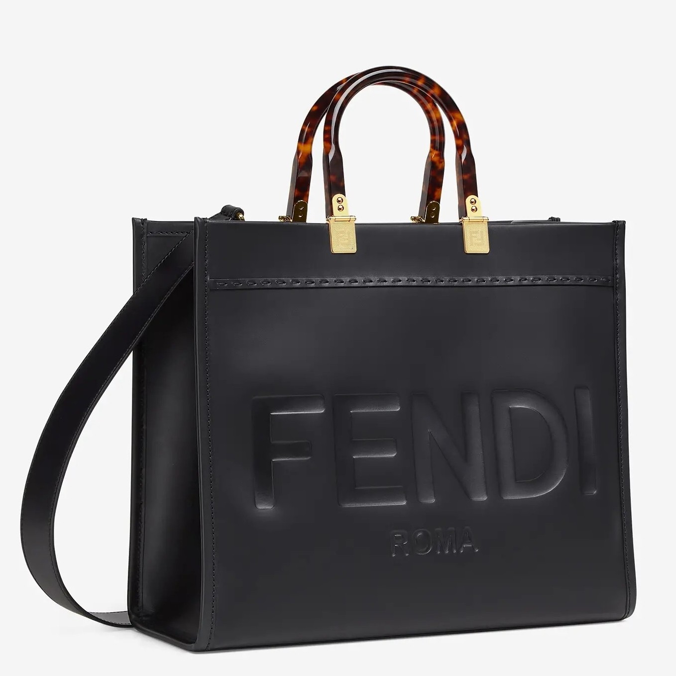 Fendi’s Sunshine Shopper tote is spacious enough for all the daily essentials, from your laptop to a spare pair of pumps. Crafted from leather in the label’s Italian atelier, it’s debossed with a statement logo. Even the tortoiseshell-effect handles are detailed with gold ‘FF’ branding.