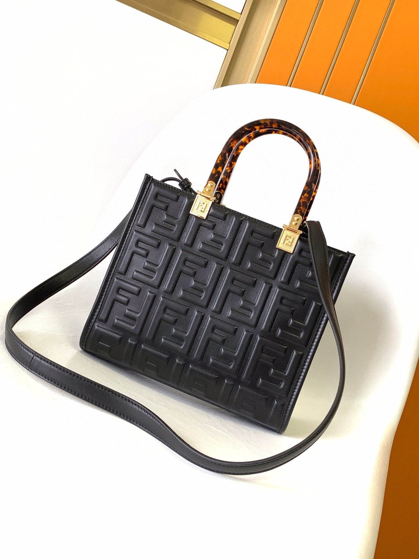 Small Sunshine Shopper bag made of calf leather with raised three-dimensional textured FF motif and rigid tortoiseshell-effect plexiglass handles.Features a spacious lined internal compartment, edges in tone-on-tone leather, and gold-finish metalware. Can be carried by hand or worn on the shoulder thanks to the two handles and detachable shoulder strap.