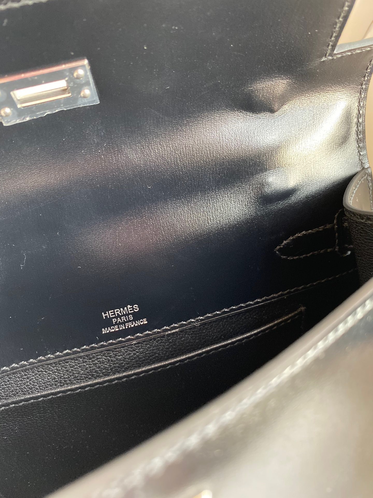 The Kelly Pochette was Jean-Paul Gaultier’s clutch interpretation of the classic Kelly bag. Introduced on the fall runway of his first collection for the House in 2004, the Kelly Pochette was an instant hit. Crafted from black Box calf leather – the first leather used by Herm??s artisans to craft bags. The pochette is a true clutch with neither feet nor shoulder strap, It opens to a matte interior that is more than sufficient to hold your i-phone, makeup, cards, cash, and sunglasses and so on.