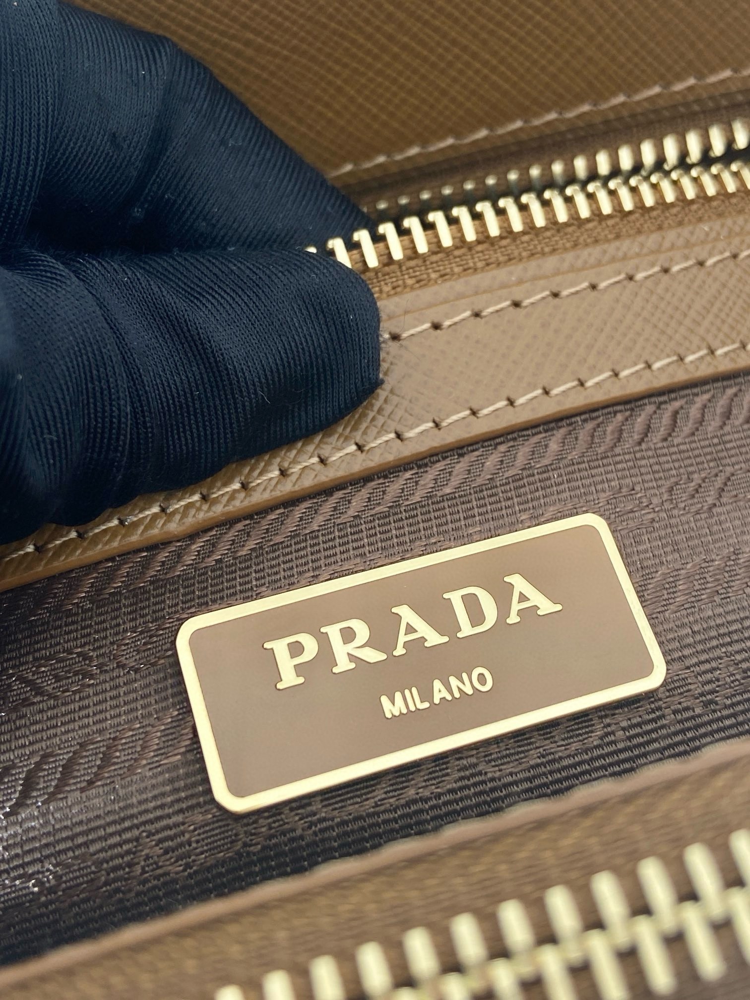 – Prada logo-print nylon lining with two pockets, including one with zipper