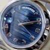 Rolex Day-Date 218206 Wave Pattern Blue Dial Platinum 41MM Mens Replica Watch,has a Platinum 41 mm Round Case with Screw Down Crown and a Platinum Bezel.Scratch resistant sapphire crystal with Cyclops magnifier.Wave Pattern Blue dial with Roman Numerals hour markers.Date Window Displayed at 3 O’Clock,Day Window Displayed at 12 O’Clock,Platinum President Bracelet will look great on your wrist.