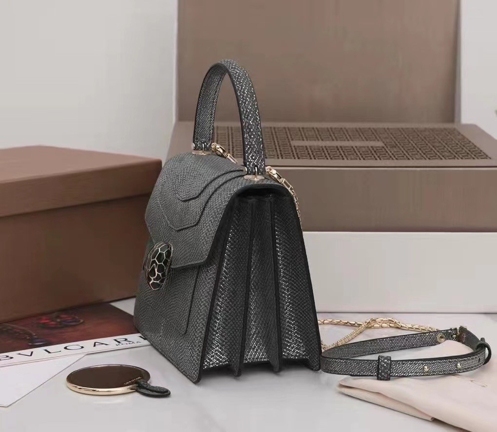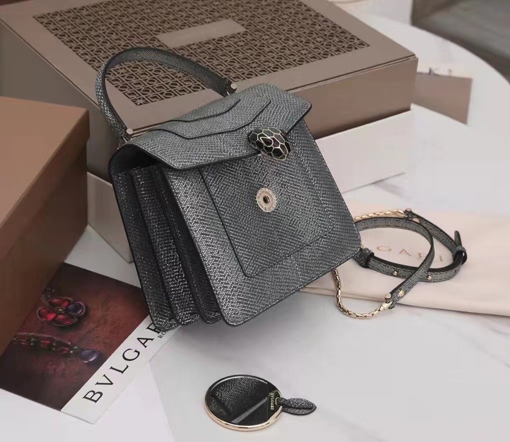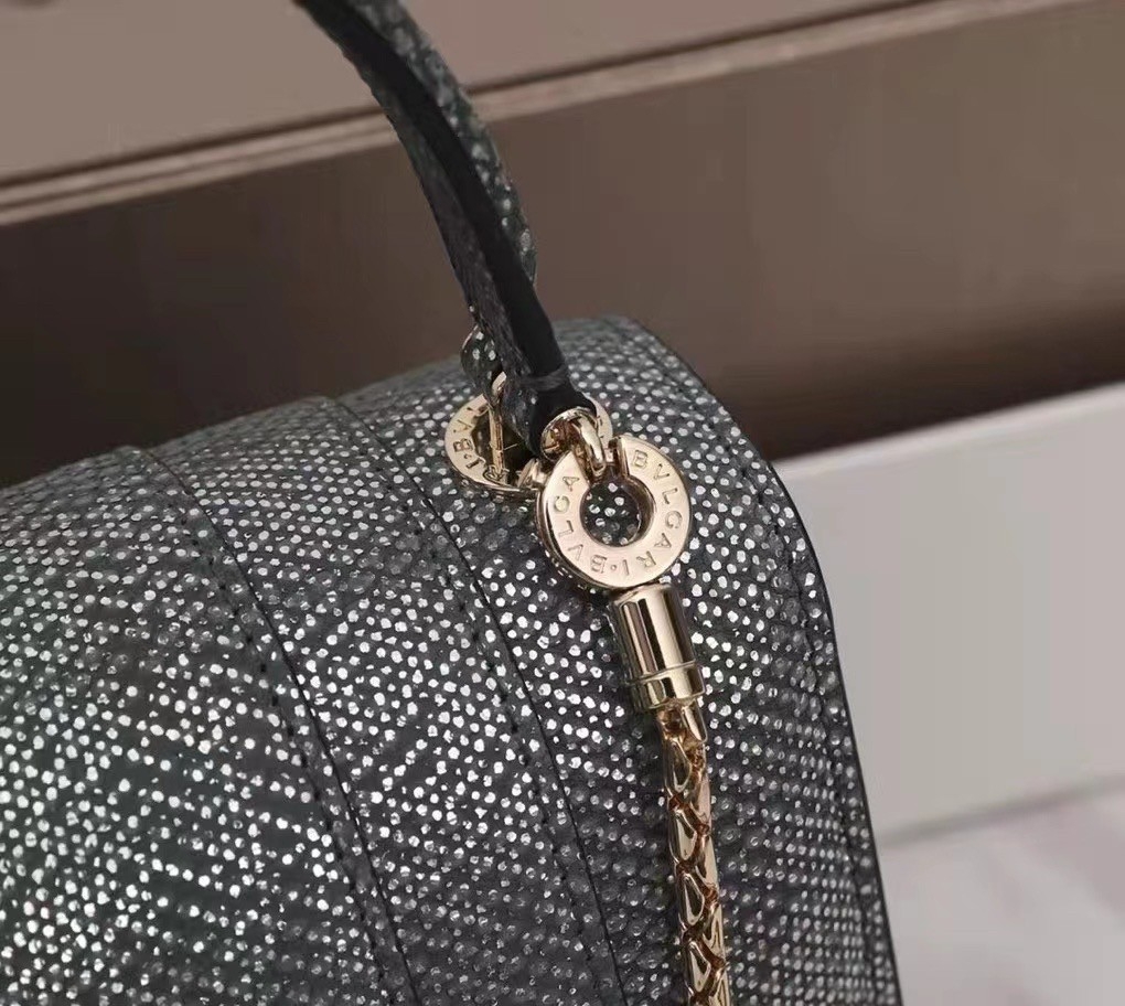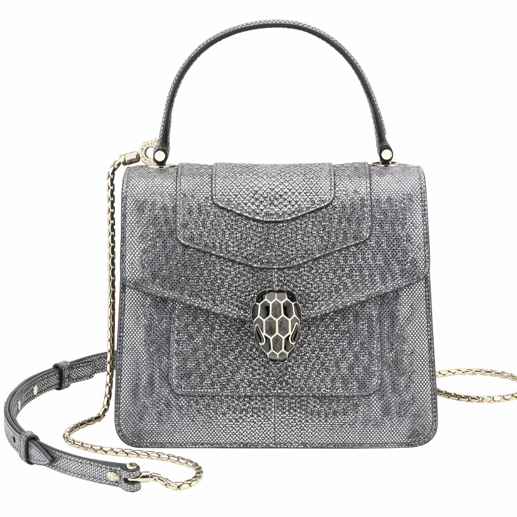 Crafted in precious charcoal diamond karung skin with a metallic finishing, the Serpenti Forever crossbody bag epitomises the mastery of Bvlgari artisans in shaping precious materials into timeless creations. The iconic snakehead closure hypnotises with its glitter charcoal diamond and shiny black enamel scales and seductive black onyx eyes.