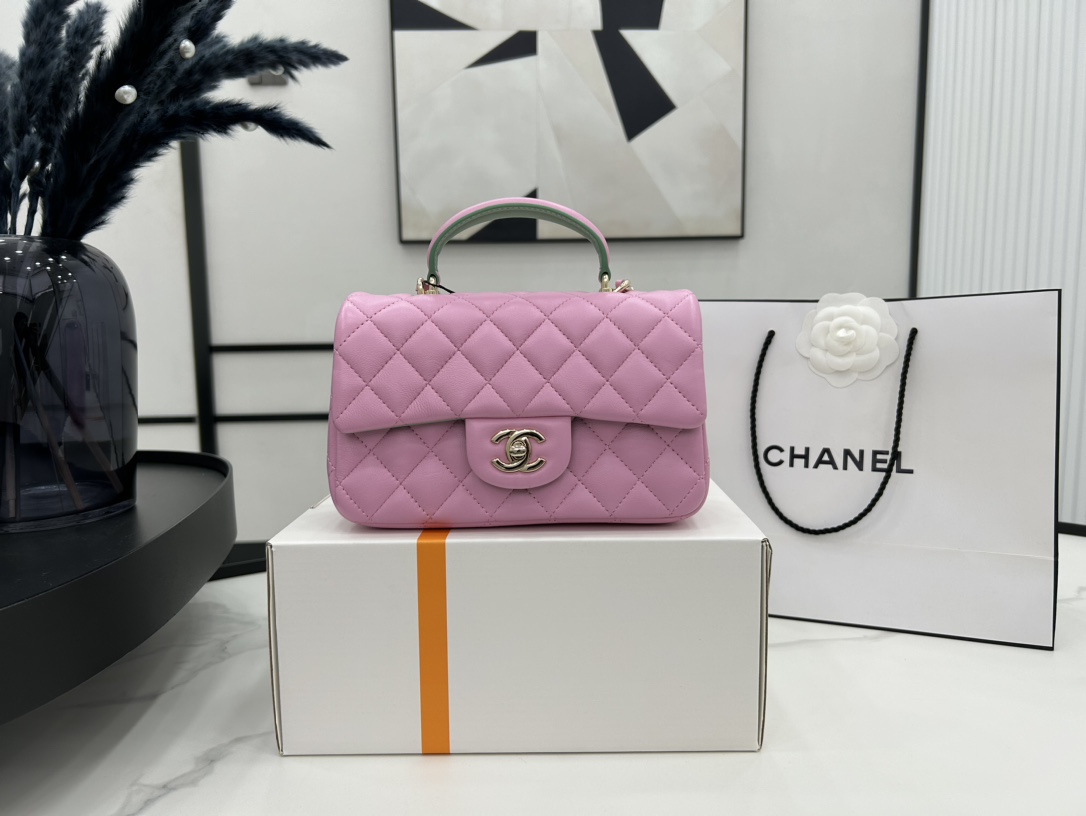 Chanel 23P Mini Flap rettangolare con manico superiore in pelle di agnello rosa e verde Hardware oro chiaro