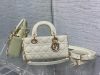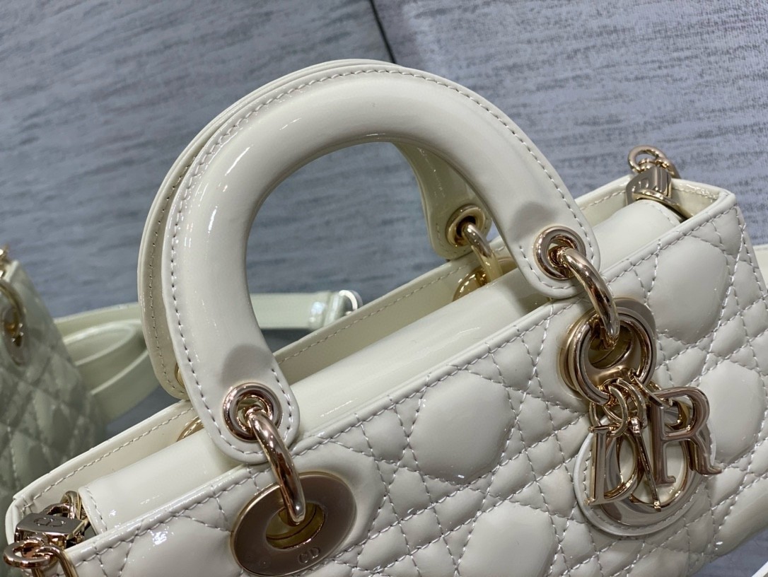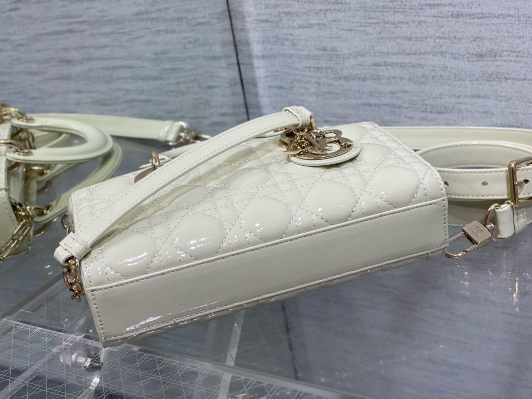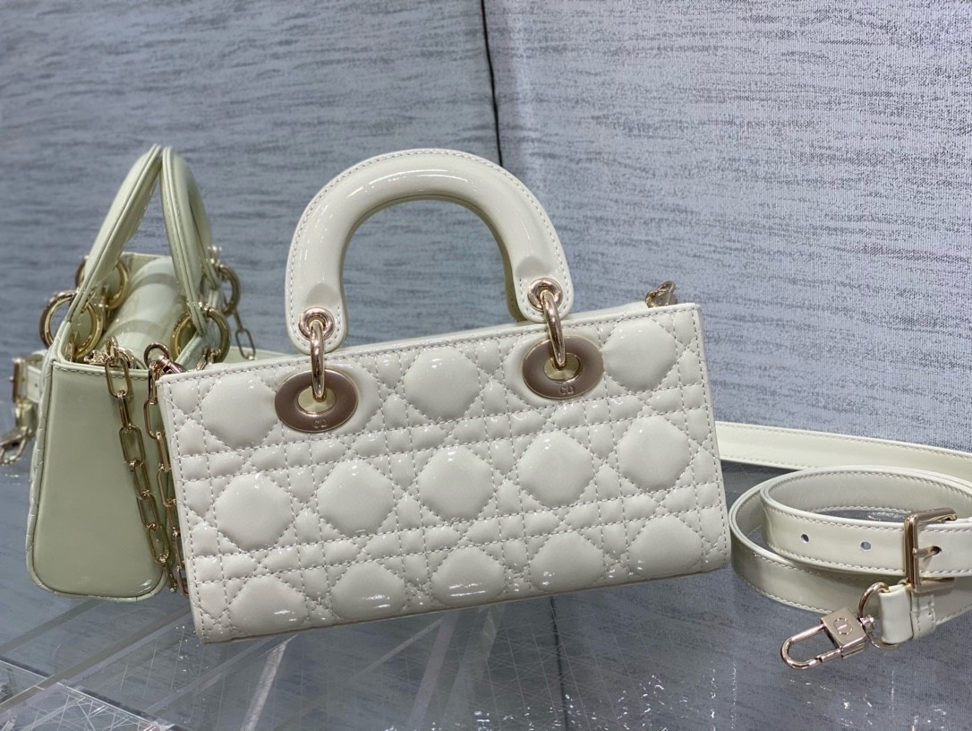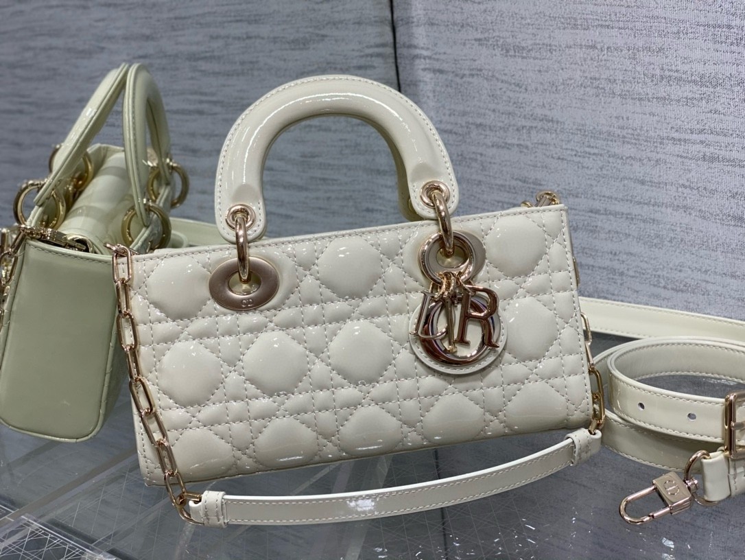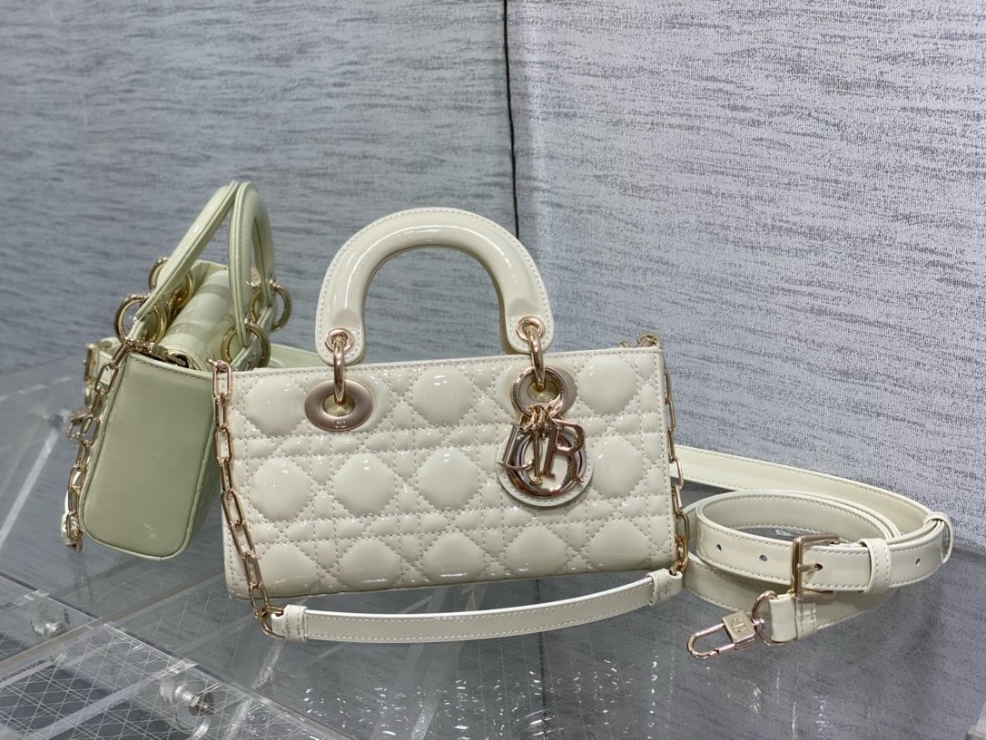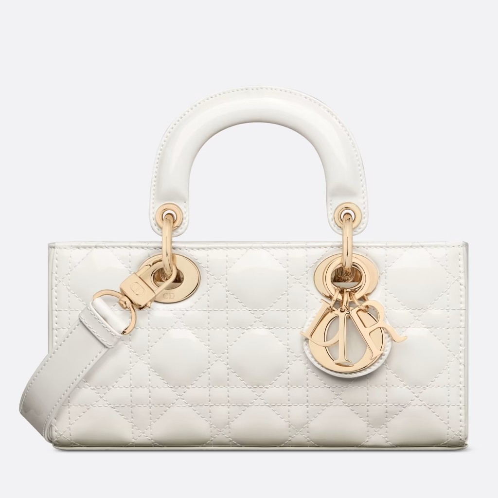The Lady D-Joy bag captures the House’s vision of elegance and beauty by showcasing the iconic streamlined aesthetic of the Lady Dior line. Crafted in patent calfskin with Cannage stitching, the legendary quilted texture is immediately recognizable. Pale gold-finish metal D.I.O.R. charms embellish and illuminate its silhouette. Featuring one removable chain strap and another adjustable and removable leather strap, the small Lady D-Joy bag can be carried by hand, worn over the shoulder or crossbody as a daily companion.