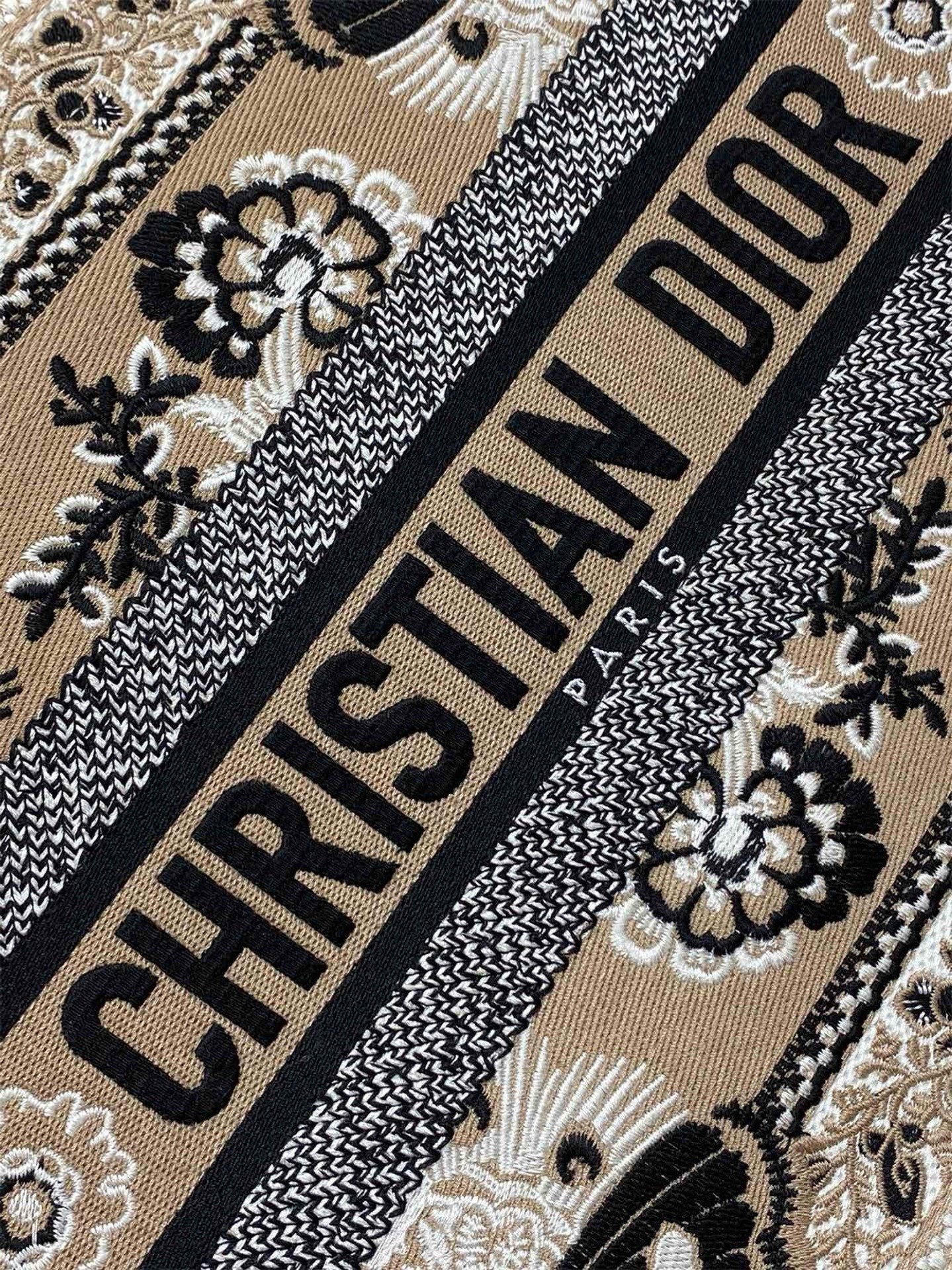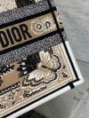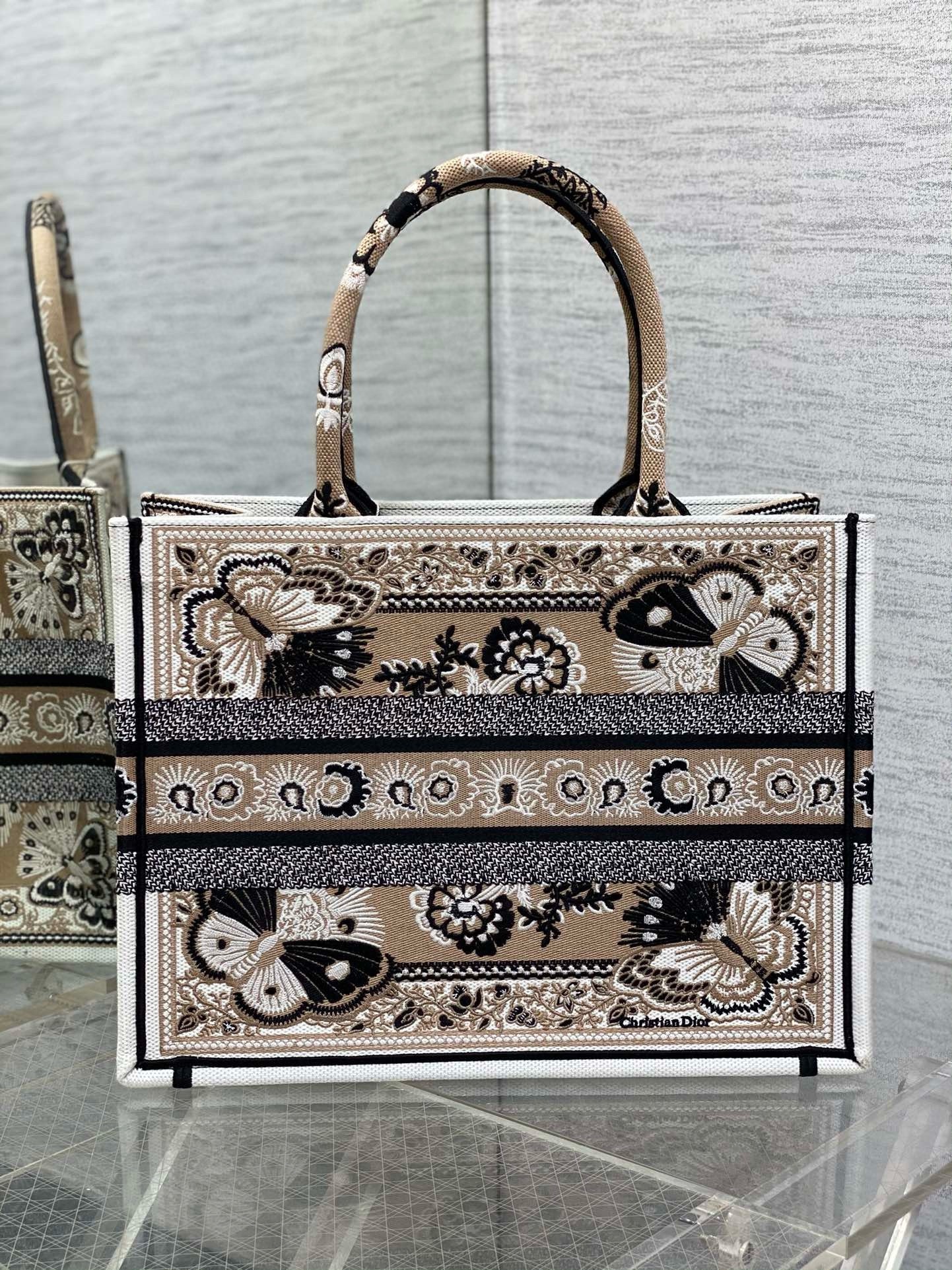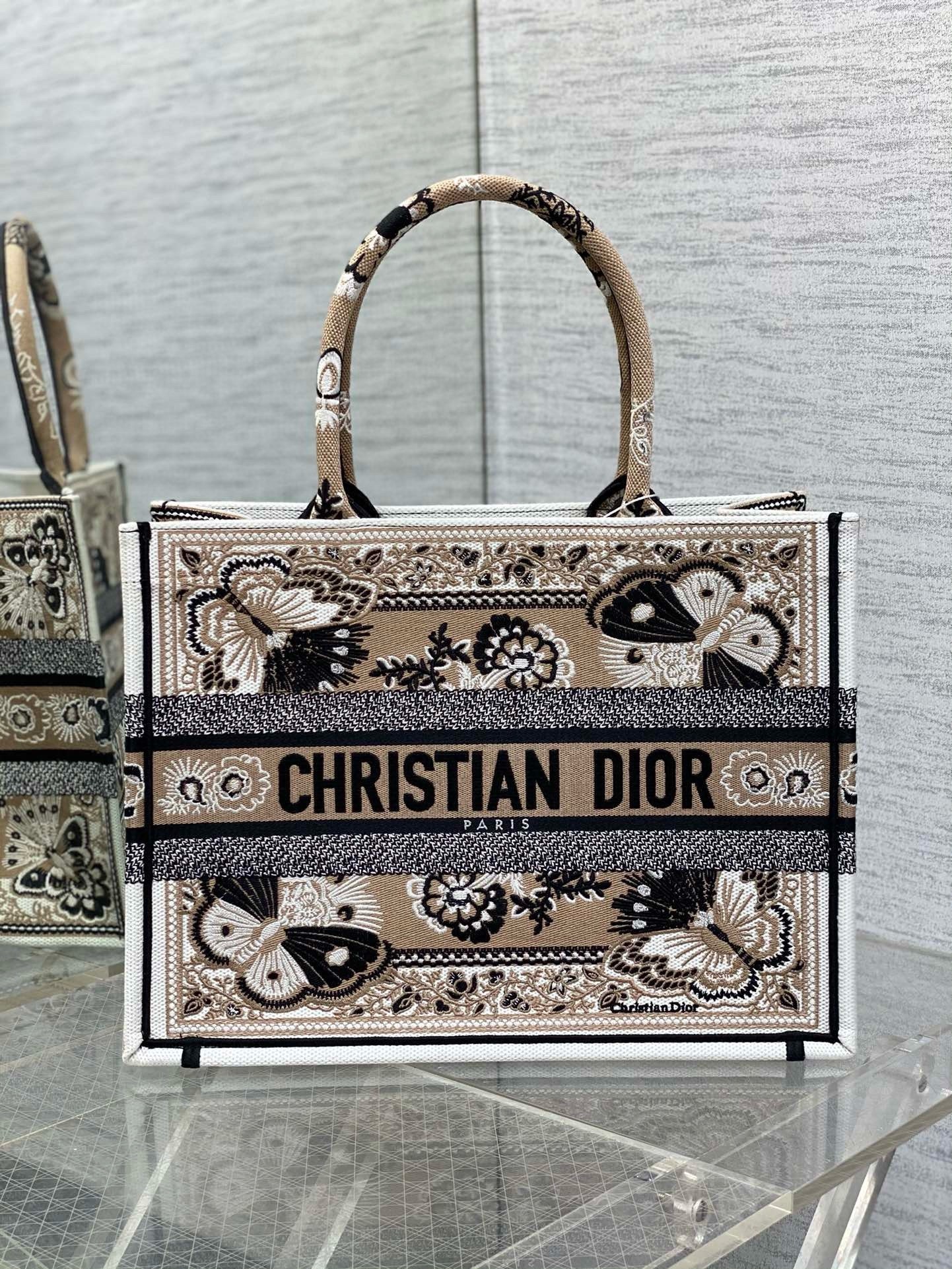 Introduced by Maria Grazia Chiuri, Creative Director of Christian Dior, the Dior Book Tote has become a staple of the Dior aesthetic. Designed to hold all the daily essentials, the style is fully embroidered with a beige multicolor Butterfly Bandana motif, combining the butterfly with the timeless bandana pattern in a graphic spirit. Adorned with the Christian Dior Paris signature on the front, the medium tote exemplifies the House’s signature savoir-faire and may be carried by hand or worn over the shoulder.