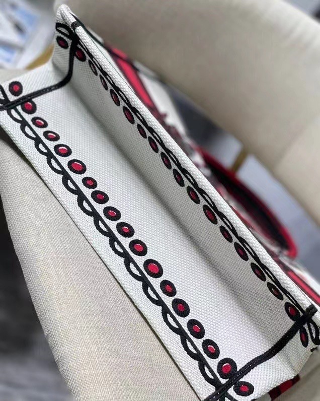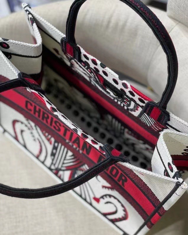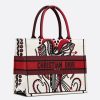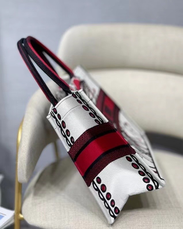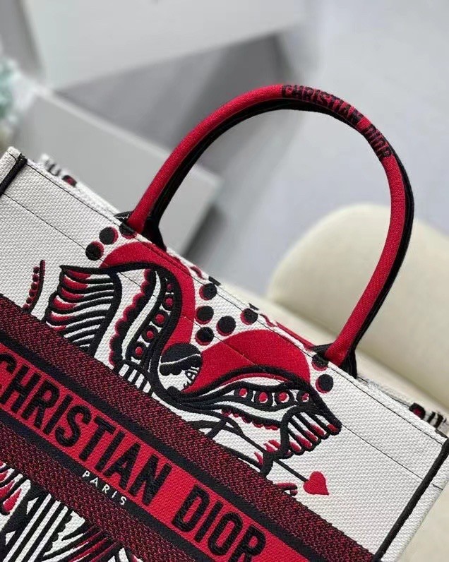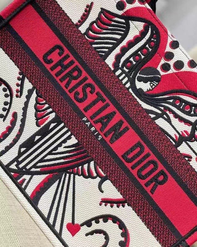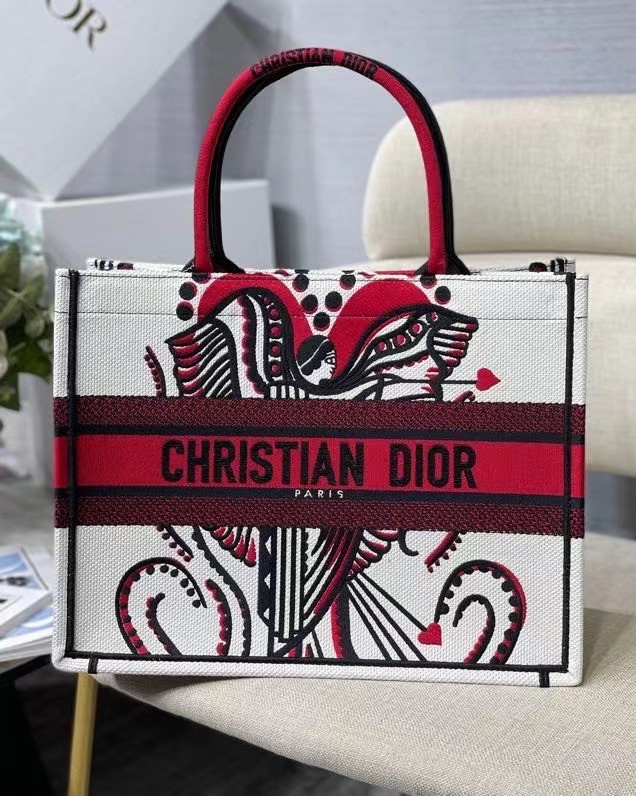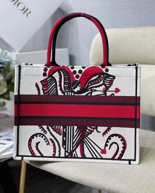 he Dior Book Tote is an original creation introduced by Maria Grazia Chiuri, Dior’s Creative Director, and has become a staple of the Dior aesthetic. Designed to hold all the daily essentials, it is fully embroidered with the latte multicolor Cupidon motif, resonating with the Greek inspiration of the collection through a romantic print. Adorned with the ‘CHRISTIAN DIOR’ signature on the front, the medium tote exemplifies the House’s signature savoir-faire and may be carried by hand or worn over the shoulder.