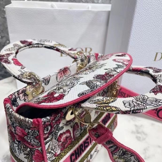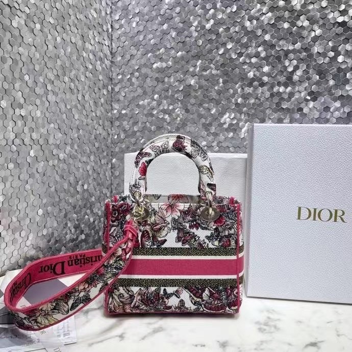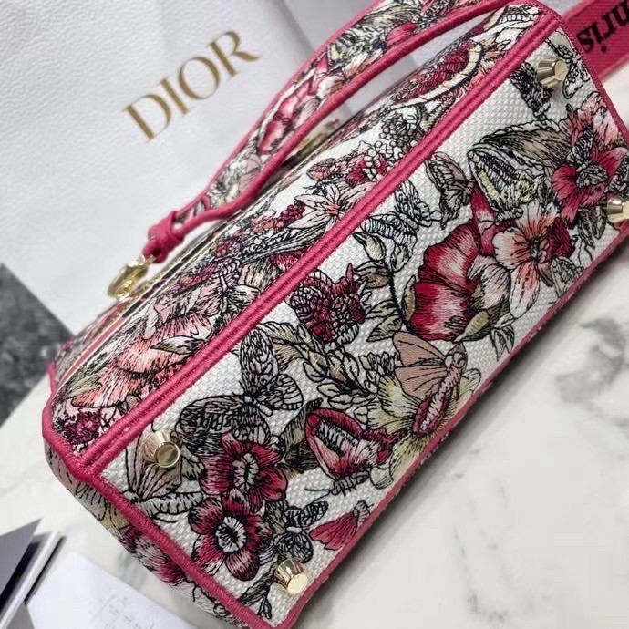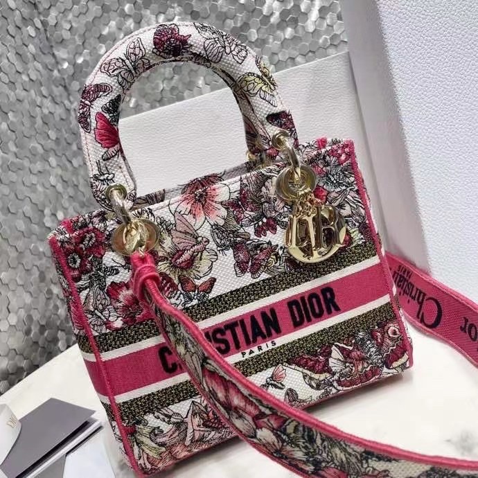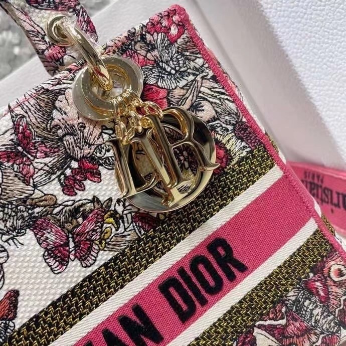 The Lady D-Lite bag combines classic elegance with House modernity. The style is fully embroidered with a poetic multicolor butterfly motif. The front features a ‘CHRISTIAN DIOR’ signature while the thick ‘D.I.O.R.’ charms in pale gold-finish metal further enhance the silhouette. Equipped with a wide, reversible and removable embroidered shoulder strap, the medium Lady D-Lite bag can be carried by hand, worn over the shoulder or crossbody.