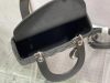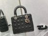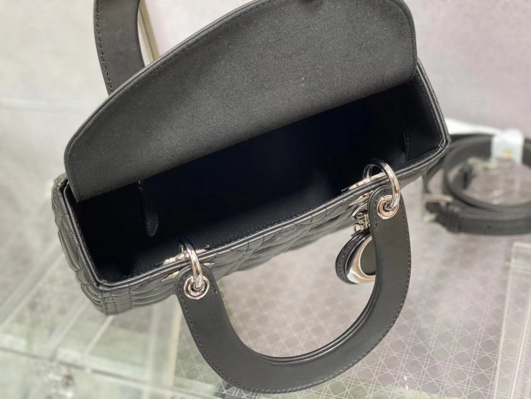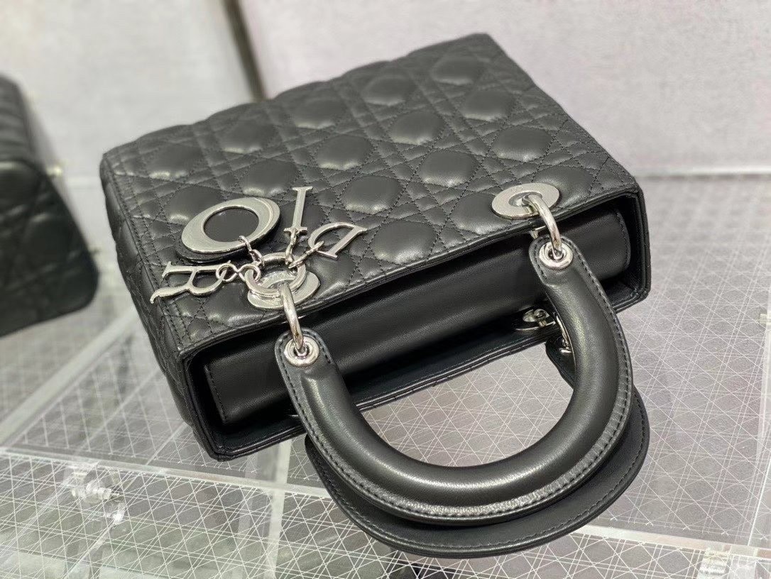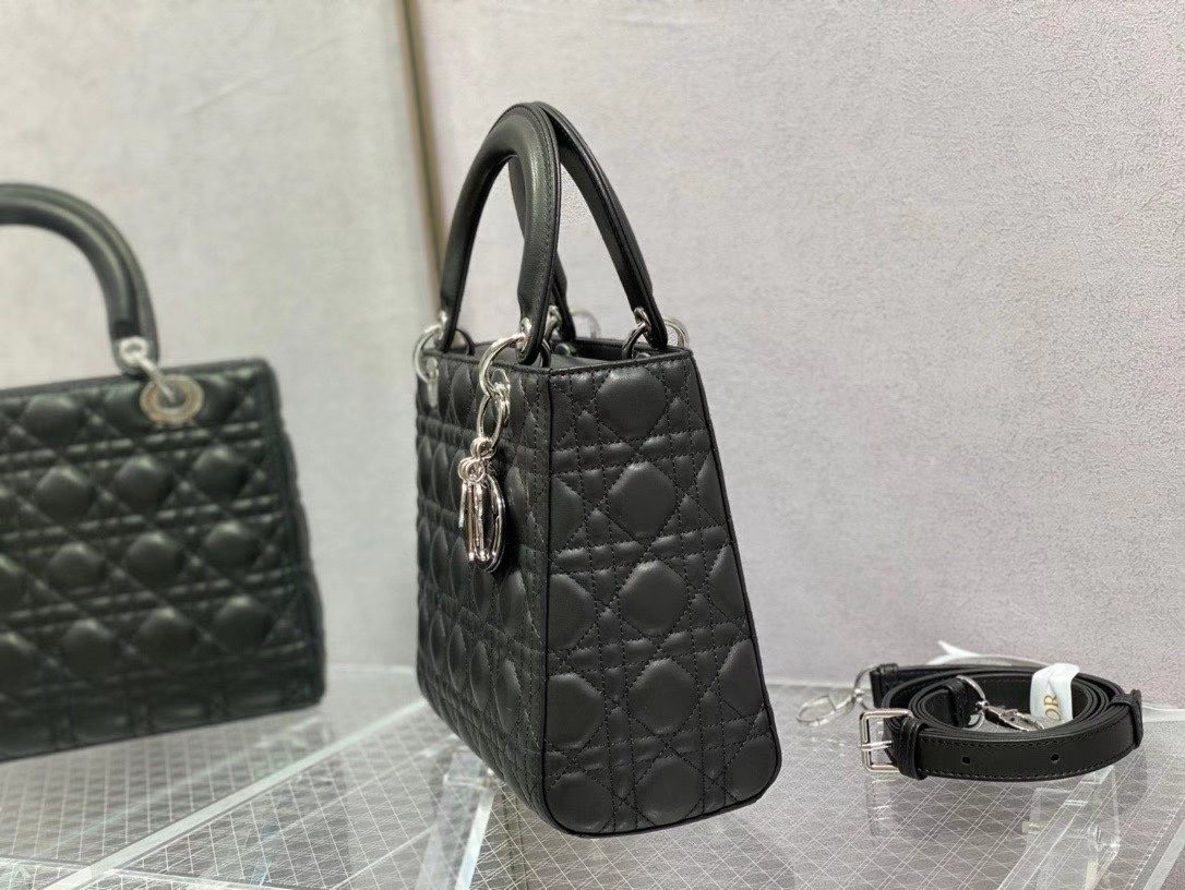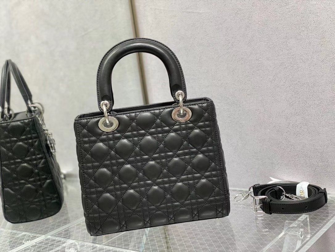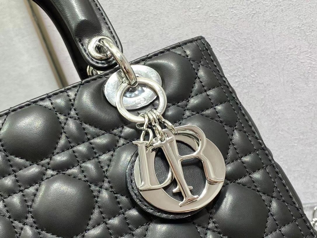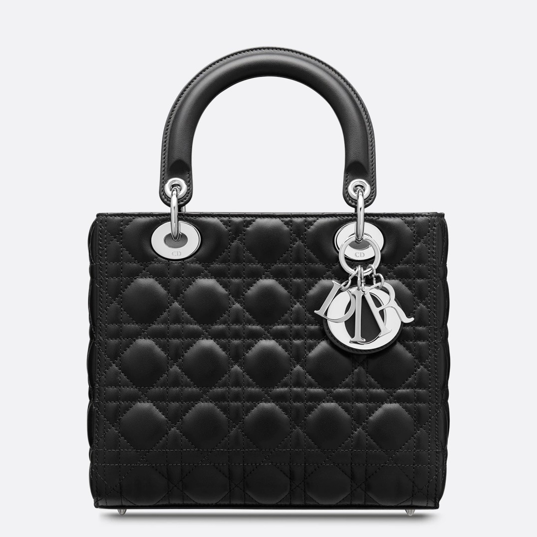 The Lady Dior bag epitomizes the House’s vision of elegance and beauty. Sleek and refined, the style is timeless. It is crafted in lambskin with Cannage stitching, creating the instantly recognizable quilted texture. Pale gold-finish metal ‘D.I.O.R.’ charms lend an elegant allure. Featuring a thin, removable leather shoulder strap, the medium design may be carried by hand or worn crossbody.