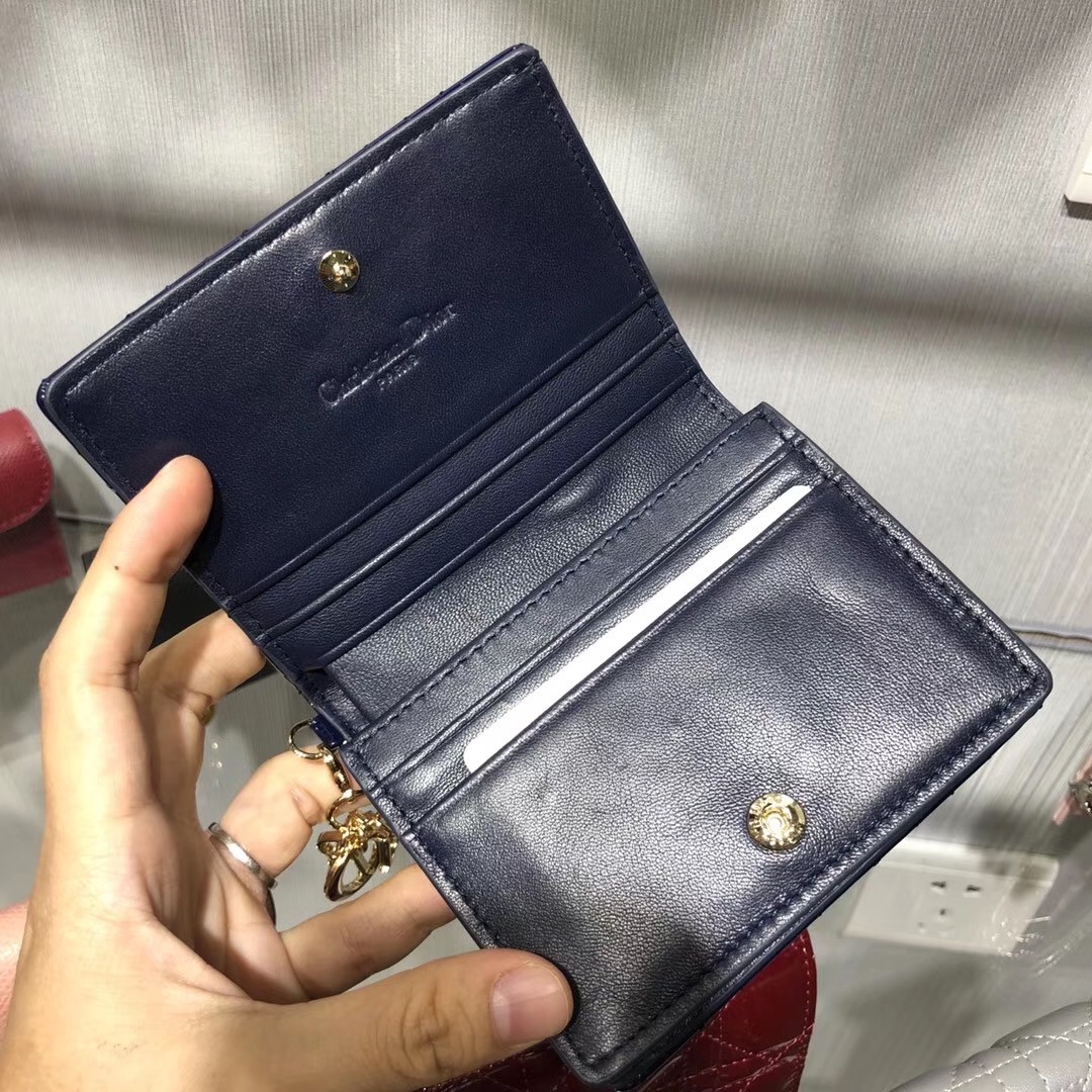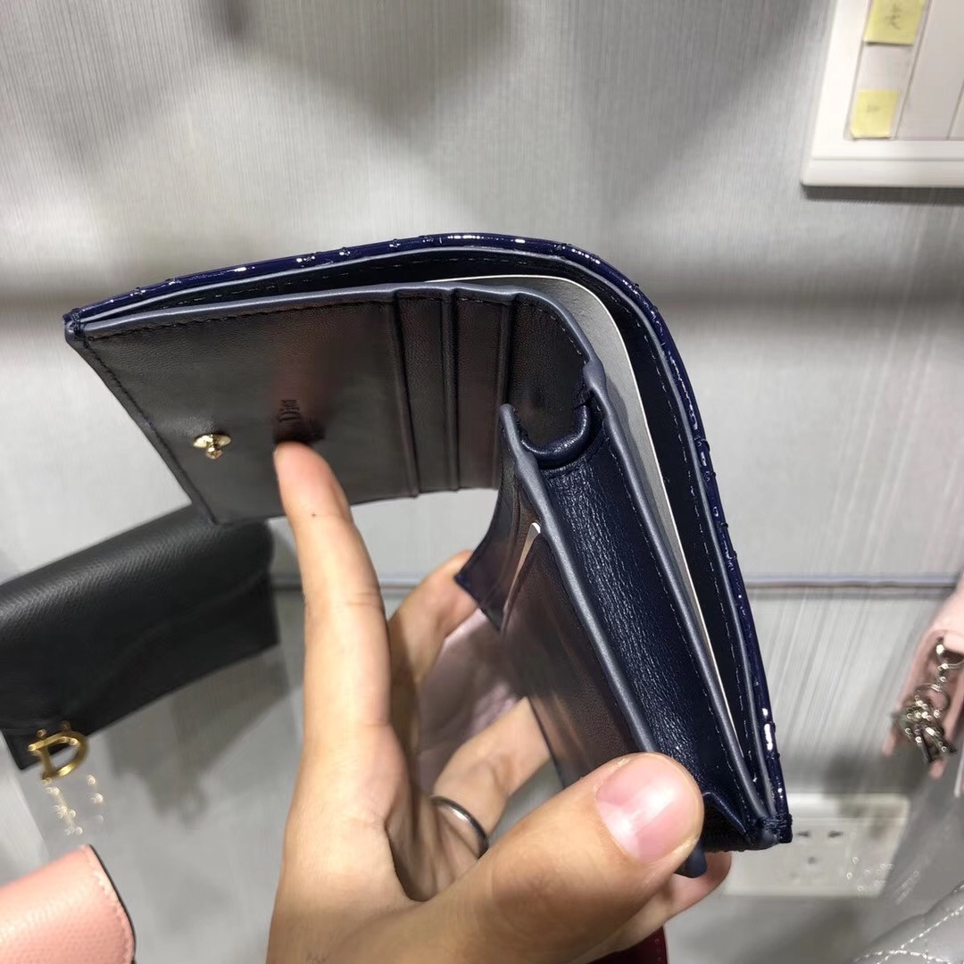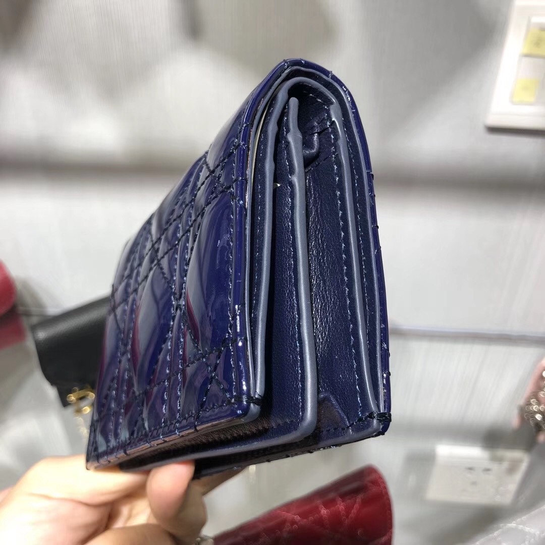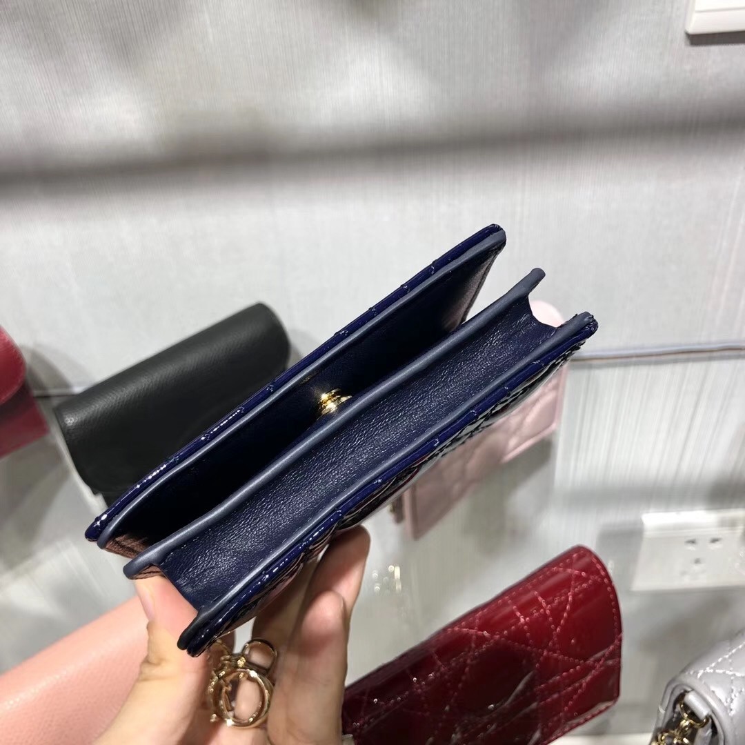 Il mini portafoglio Lady Dior è realizzato con una moderna interpretazione del classico motivo Cannage di Dior in pelle di vitello verniciata blu indaco. Caratterizzato da una delicata lucentezza e rifinito con il caratteristico charm "D.I.O.R." sul lato, questo pezzo può essere facilmente aggiunto ad altri pezzi della linea Lady Dior. Il portafoglio di dimensioni ridotte può contenere l'essenziale e può essere aggiunto a una serie di borse.