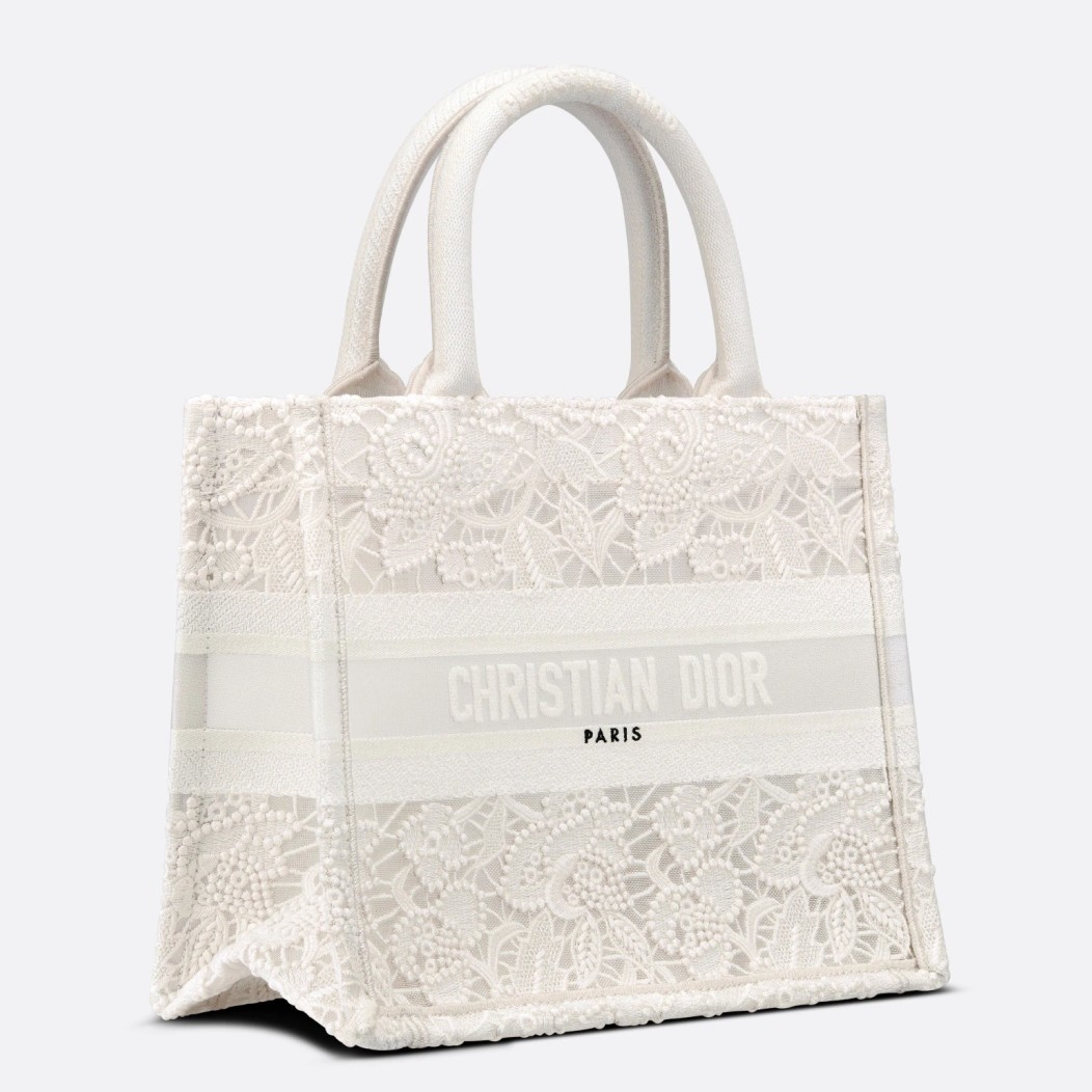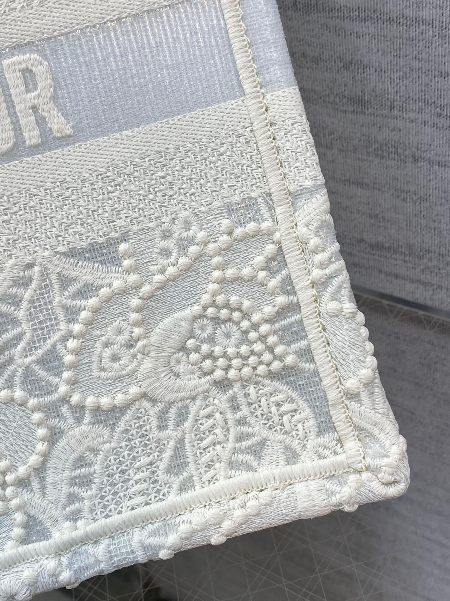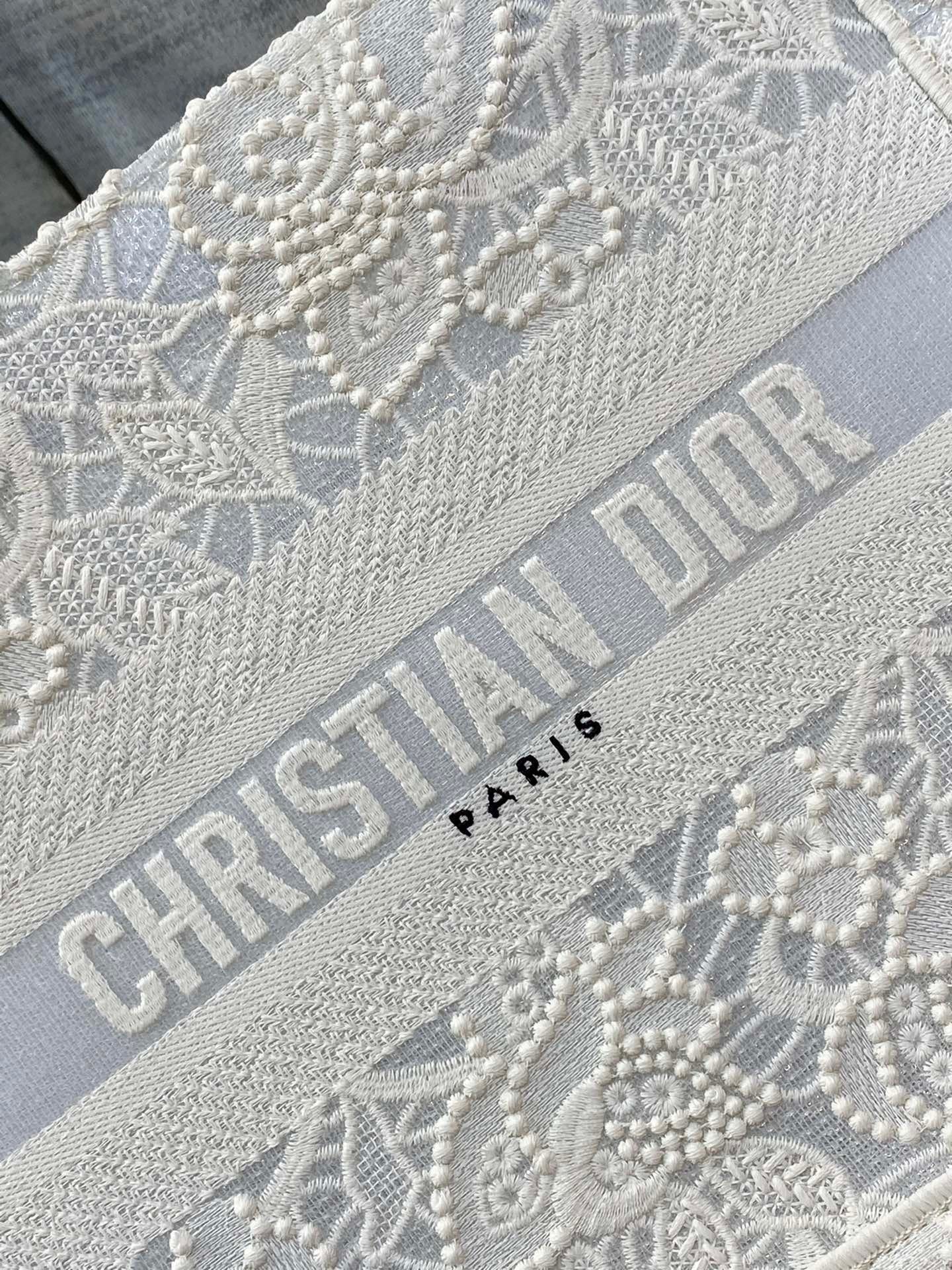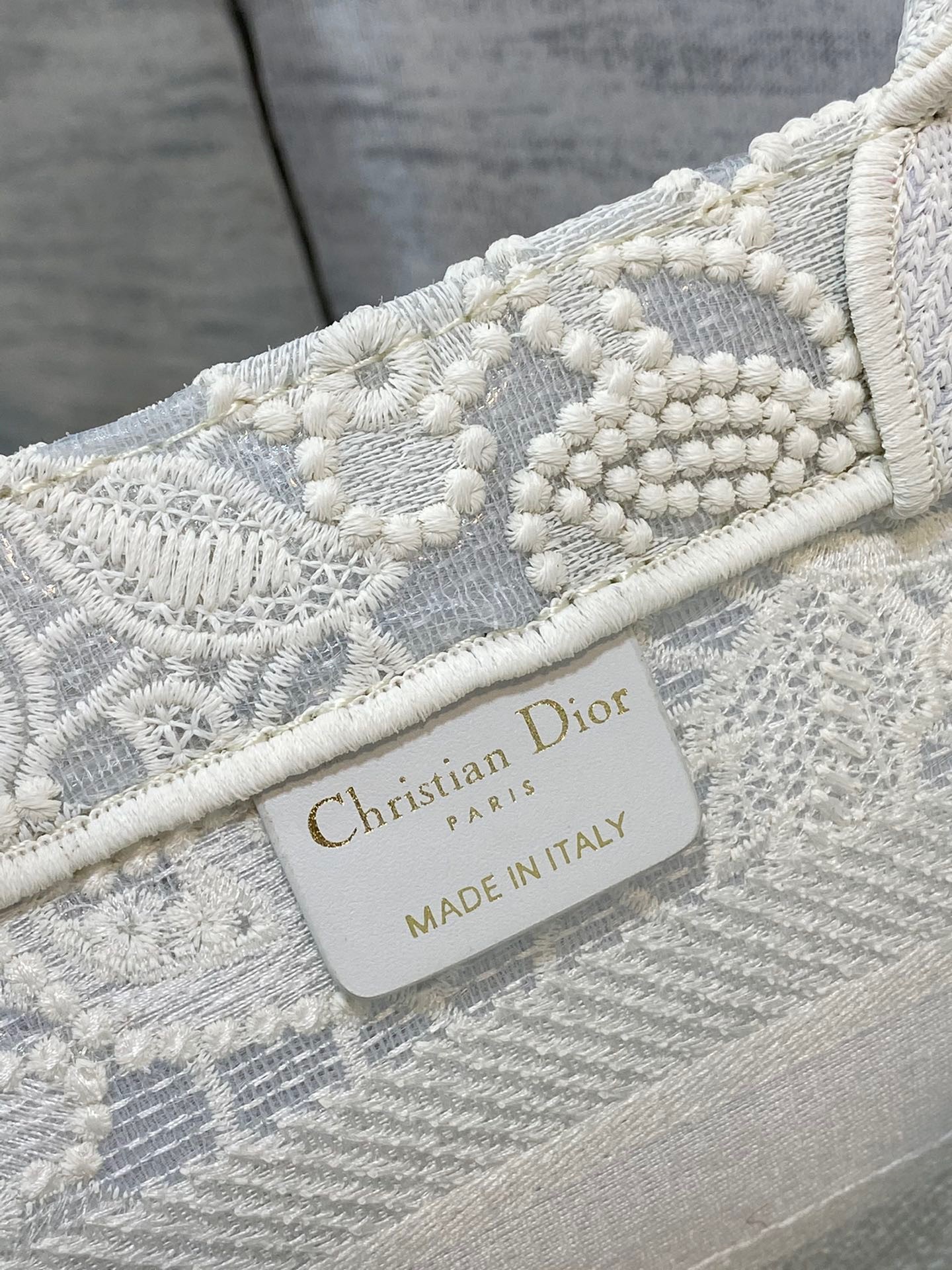 Introduced by Maria Grazia Chiuri, Creative Director of Christian Dior, the Dior Book Tote has become a staple of the Dior aesthetic. Designed to hold all the daily essentials, the style is fully embroidered with a natural macram?? effect, a true statement of elegance. Adorned with the ‘CHRISTIAN DIOR PARIS’ signature on the front, the small tote exemplifies the House’s signature savoir-faire and may be carried by hand.