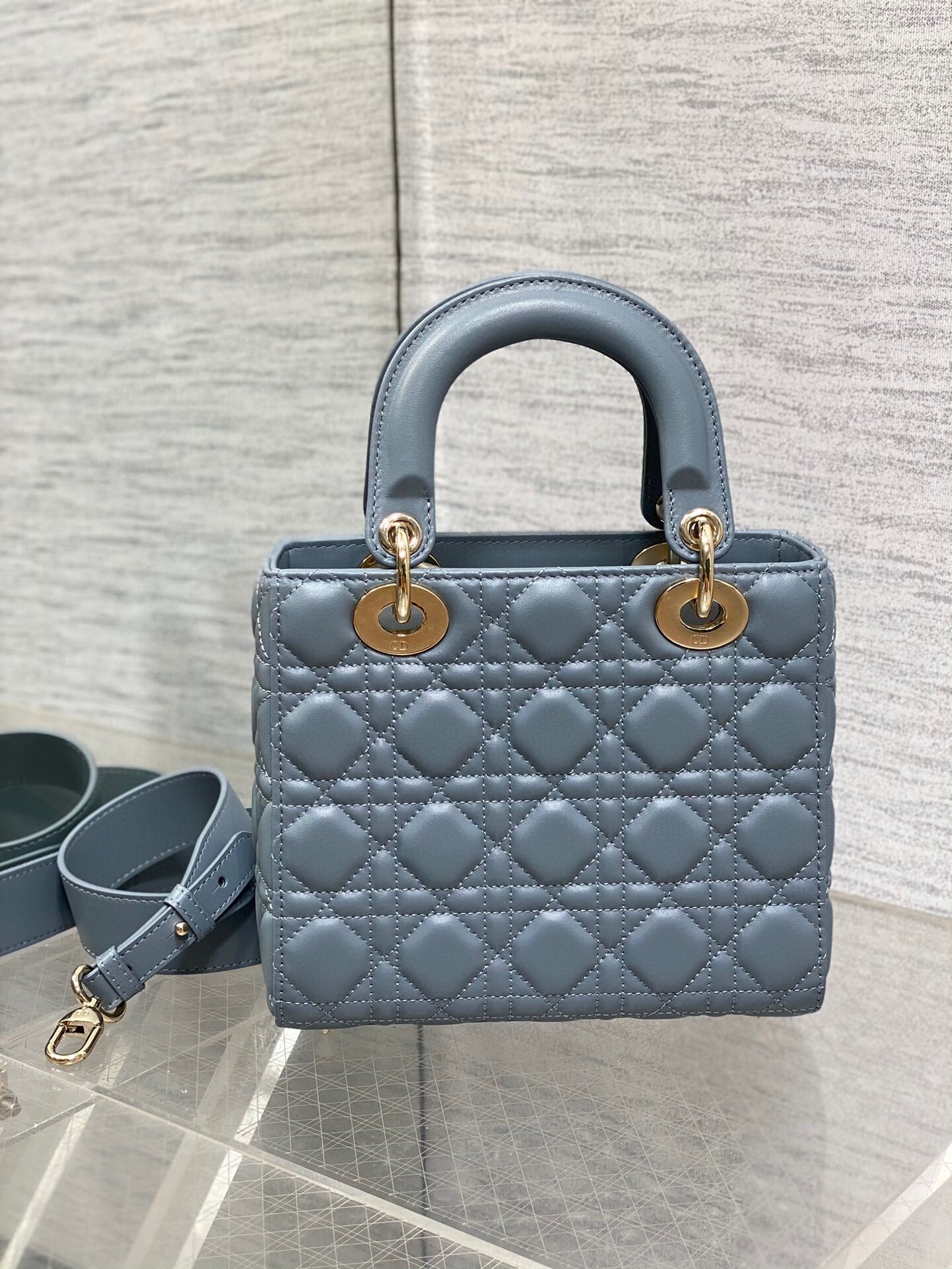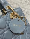 The Lady Dior My ABCDior bag epitomizes the House’s vision of elegance and beauty. Sleek and refined, the timeless style is crafted in lambskin with Cannage stitching, creating the instantly recognizable quilted texture, while the pale gold-finish metal ‘D.I.O.R.’ charms embellish and illuminate the silhouette. Featuring a shoulder strap that can be customized by adding badges, the small, unique style may be carried by hand or worn crossbody.