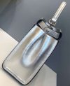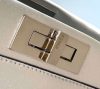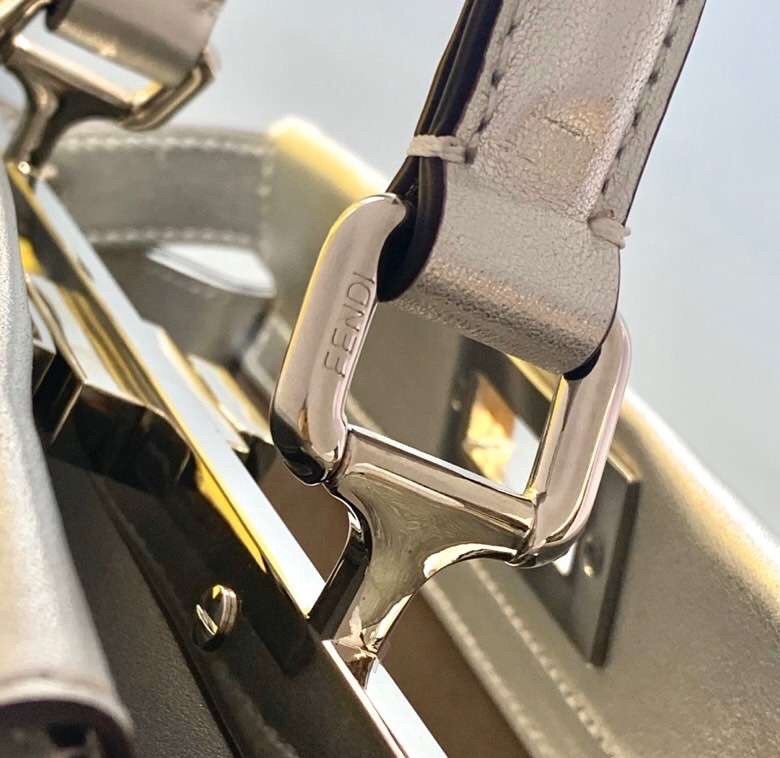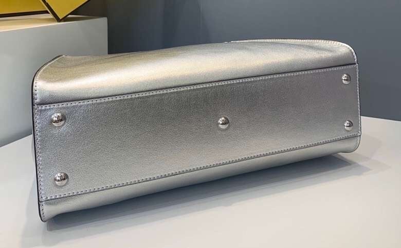 Medium handbag made with two compartments divided by a stiff partition. Twist lock on both sides. Lining with zip pocket. Single handle and an adjustable, detachable shoulder strap. Made of mirror-effect silver leather. Palladium-finish metalware.