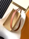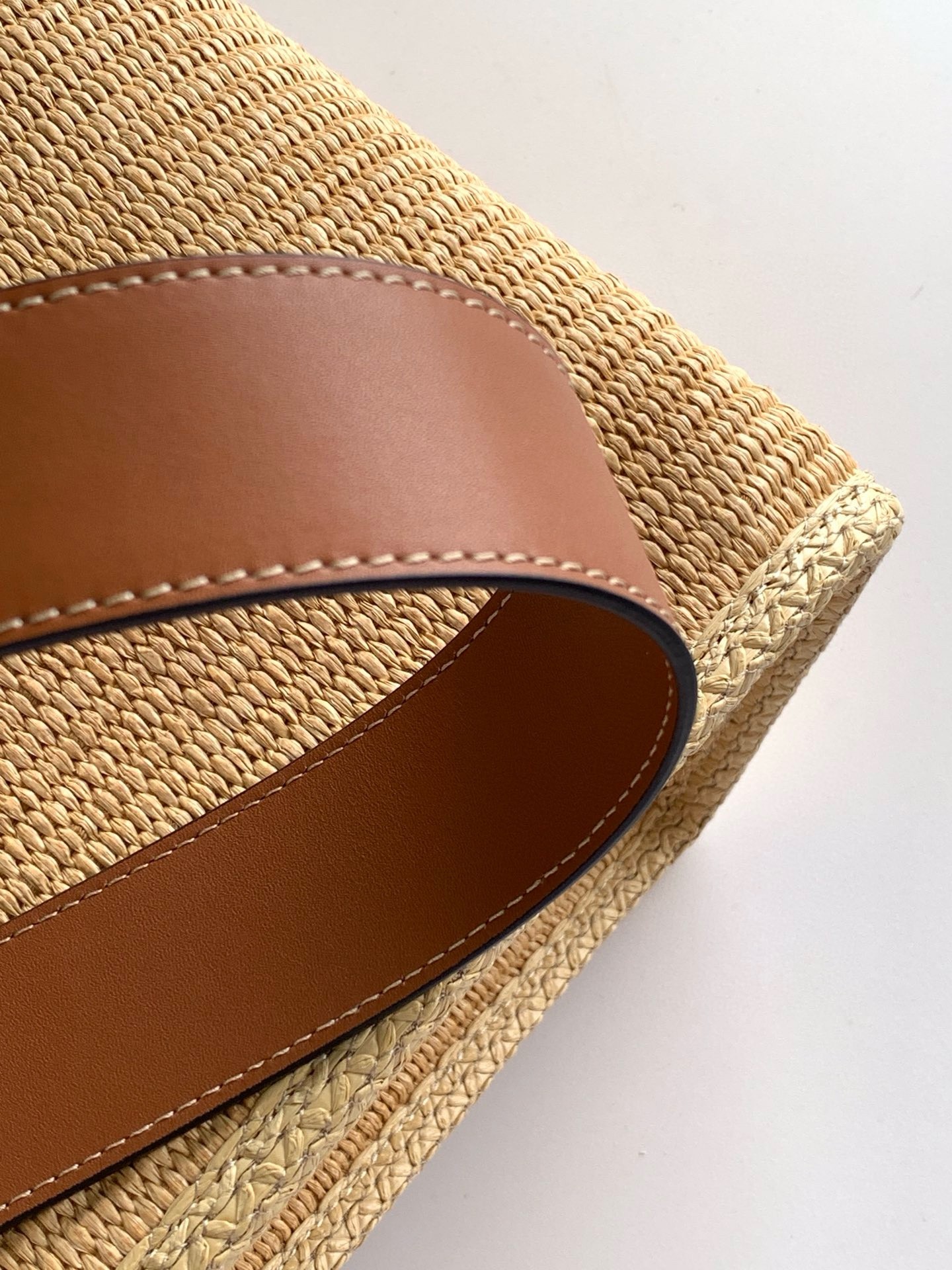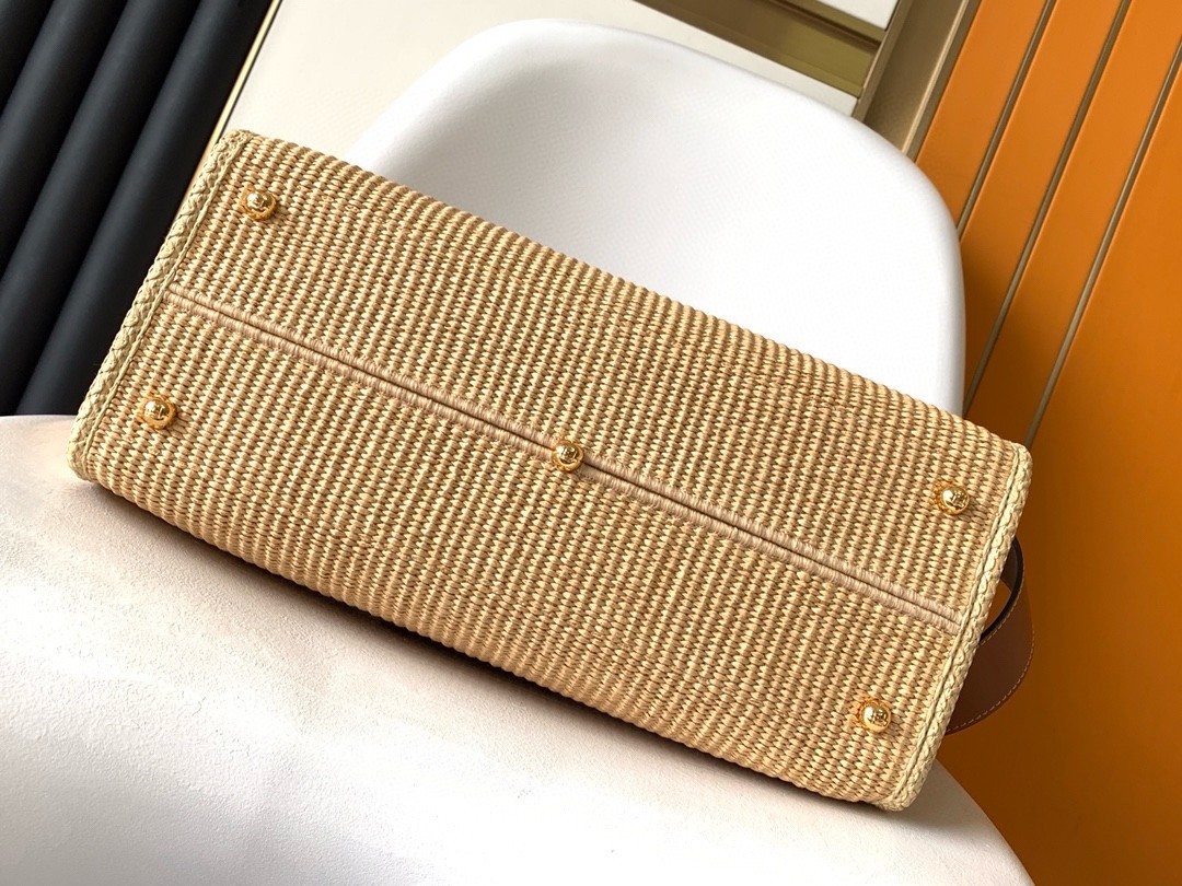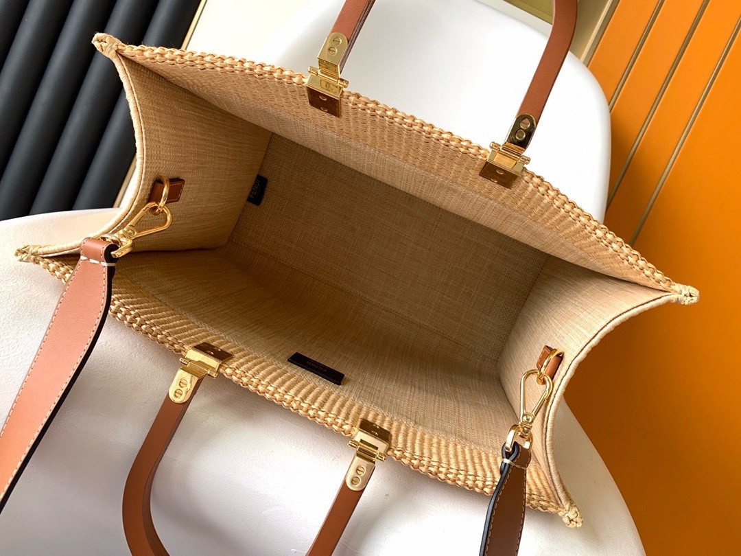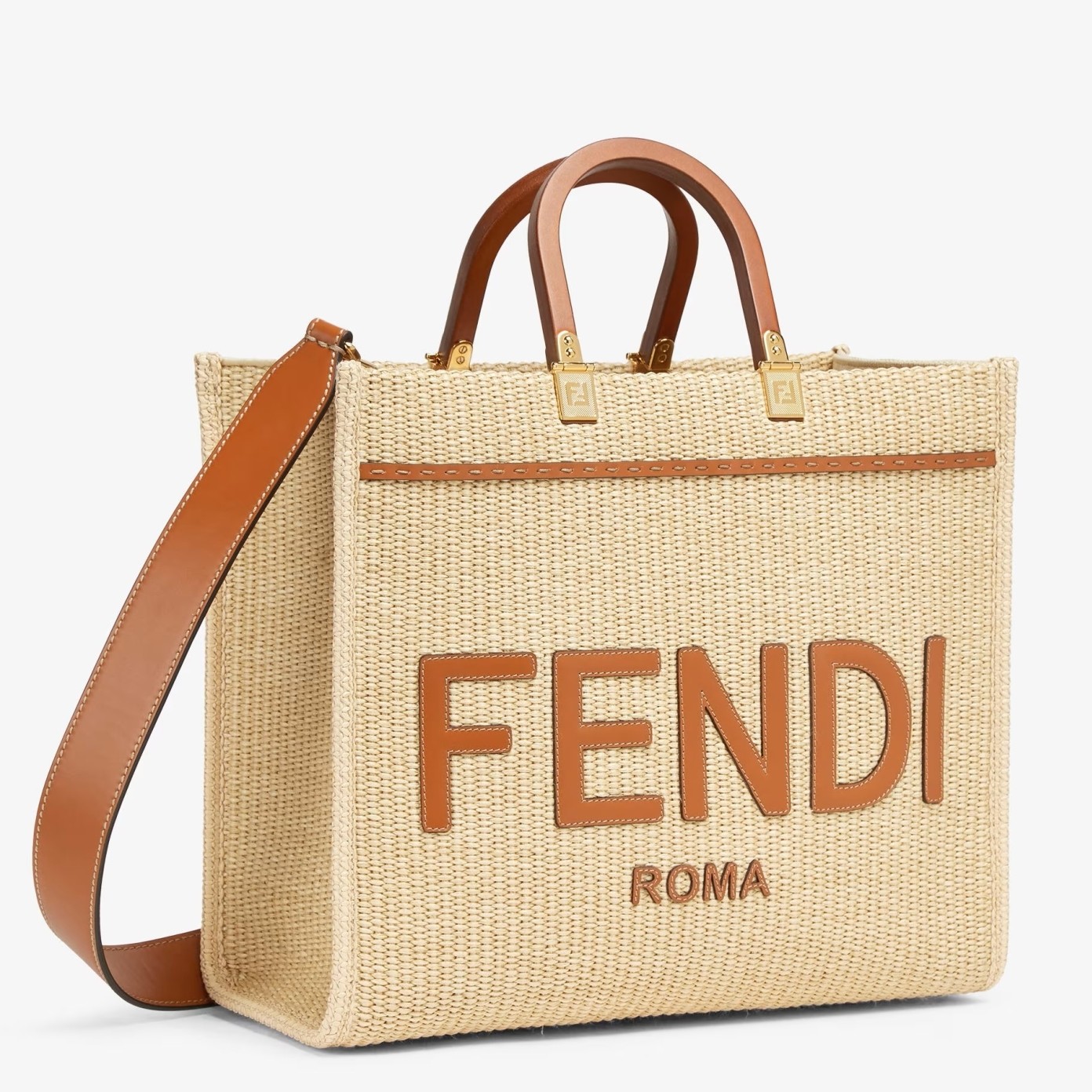 Medium sunshine shopper made of natural-colored straw woven in a moss-stitch effect with the FENDI ROMA lettering in brown leather. Stiff leather handles. Featuring a spacious lined internal compartment, brown leather profiles and gold-finish metalware. Can be carried by hand or worn on the shoulder thanks to the two handles and detachable shoulder strap.