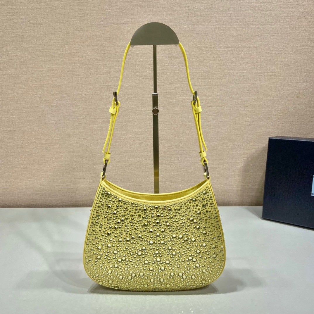 Feminine, elegant and modern, the Prada Cleo bag is made of satin and embellished with luminous crystals of different sizes that give the bag refined charm. The sinuous shape that recalls archive styles makes the accessory iconic.