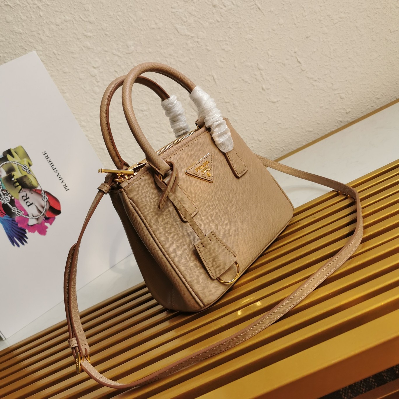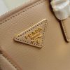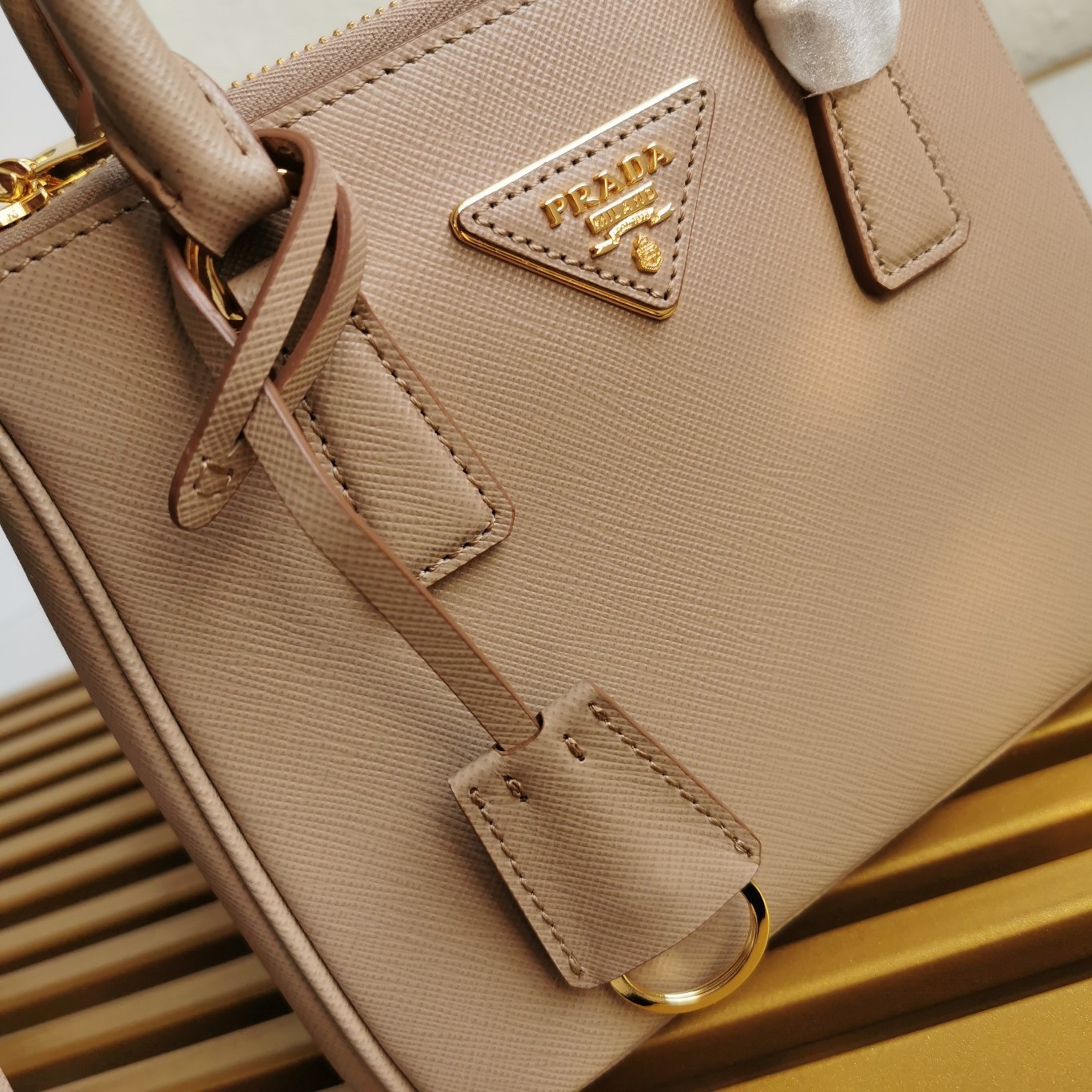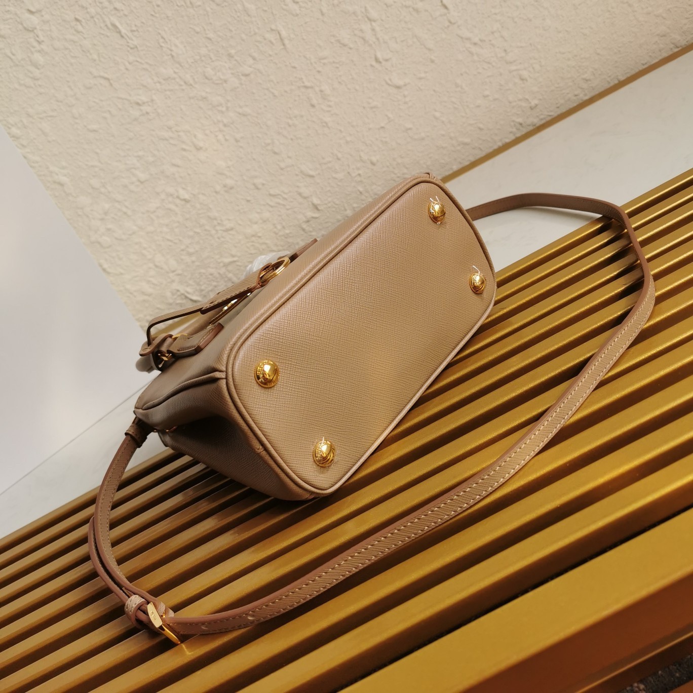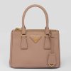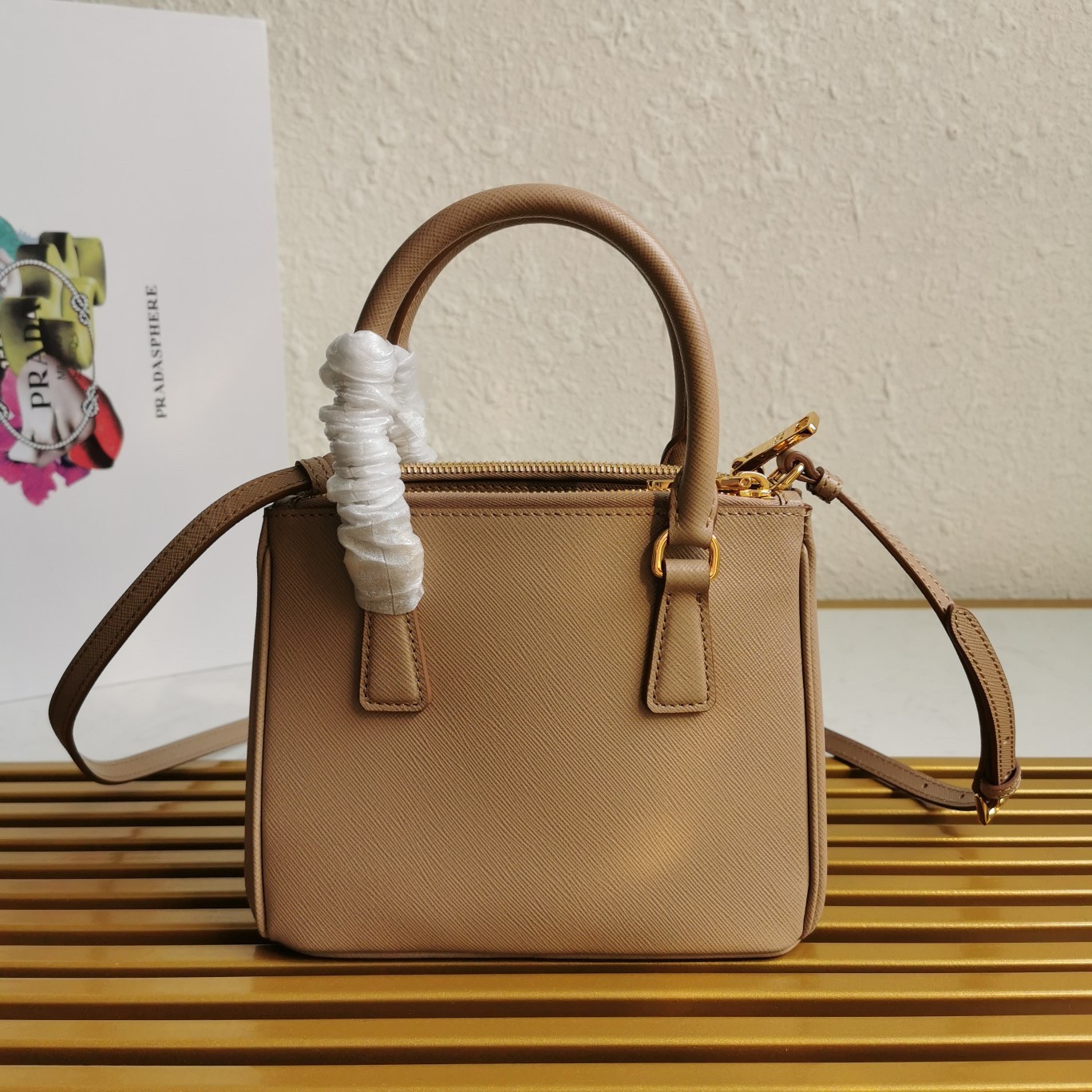 Production of the Prada Galleria bag, composed of 83 pieces, is an authentic fusion between industrial precision and the refined accuracy of craftsmanship that can only be performed by hand. The design is clean and elegant yet innately pragmatic, an aesthetic language blending form and function that combines history and modernity. Originating the definition of “timeless”, the Galleria bag has become a hallmark of Prada’s identity in the twenty-first century. The accessory, presented in the mini version, is made of iconic Saffiano leather that was patented by the founder of the brand and features a crosshatch texture and waxed finish.
