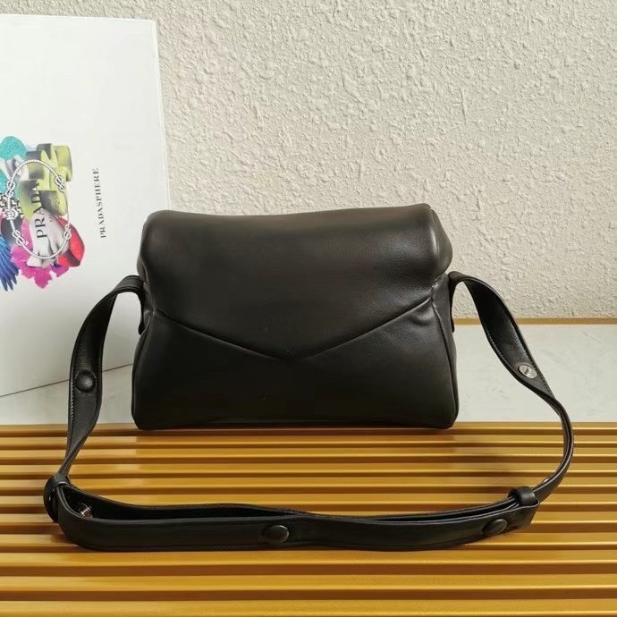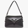 This soft nappa leather shoulder bag with sleek, minimalist lines has a contemporary attitude and a special reverse stitch construction. A study of the triangle inspires new geometric details and unique interpretations of the historic Prada logo. The iconic shape is reworked in the wide flap of this slightly padded accessory, completed by an adjustable leather handle that lets it be worn in different ways.