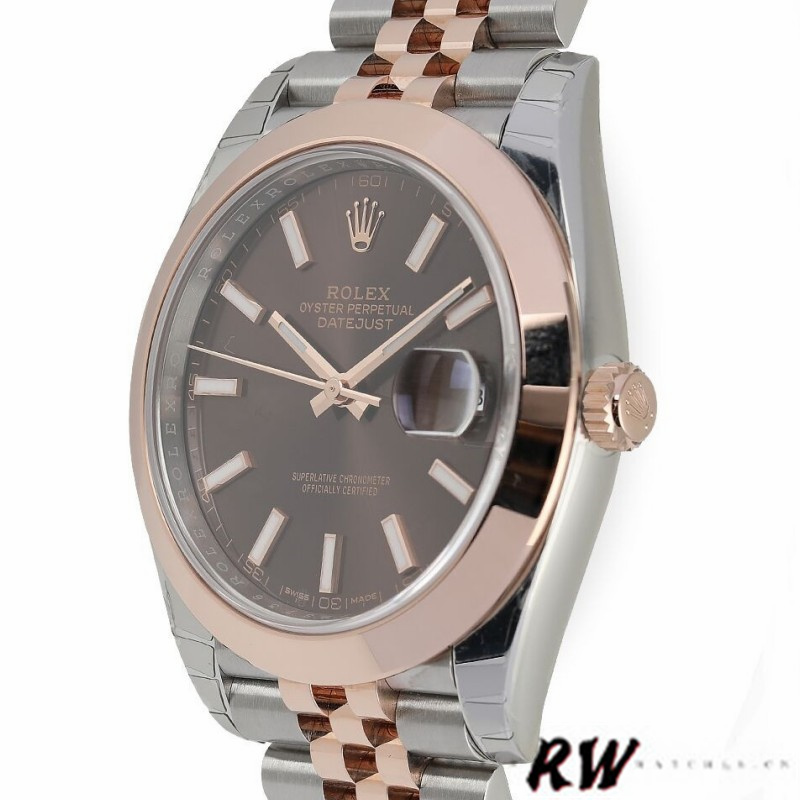 Rolex Datejust 126301 Rose Gold Chocolate Brown Index Dial 41MM Mens Replica Watch,41mm Everose Rolesor case with steel monobloc middle case, screw-down steel back, Everose Gold screw-down crown, Everose Gold smooth bezel, scratch-resistant double anti-reflective sapphire crystal with cyclops lens over the date, chocolate brown dial with Index Hour Markers. Date at 3 o’clock that changes instantaneously at midnight in a few thousandths of a second, Everose Rolesor Jubilee bracelet made from a combination of steel and Everose Gold with five-piece links, folding OysterClasp buckle with Easylink comfort extension link.
