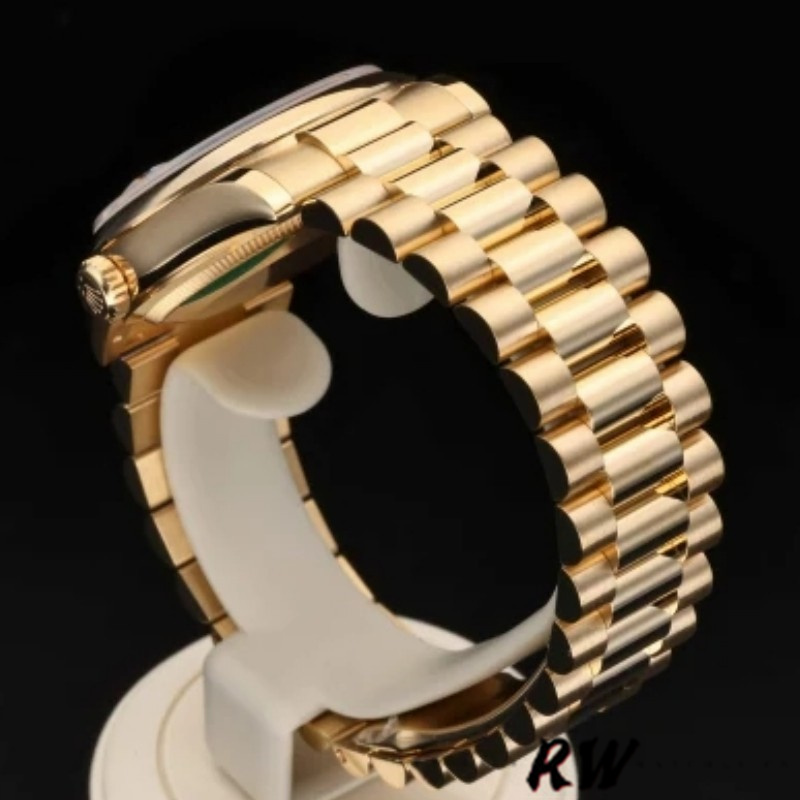 Rolex Day-Date 118208 Black Diamond Dial 36mm Unisex Replica Watch. 36mm yellow gold case with a yellow gold Rolex president bracelet. Fixed domed yellow gold bezel. Black dial with gold-tone hands and Diamonds numeral hour markers. Minute markers around the outer rim. Date display at the 3 o’clock position. Day of the week display centered on the 12 o’clock position. Scratch resistant sapphire crystal. Screw down crown. Solid case back. Round case shape.