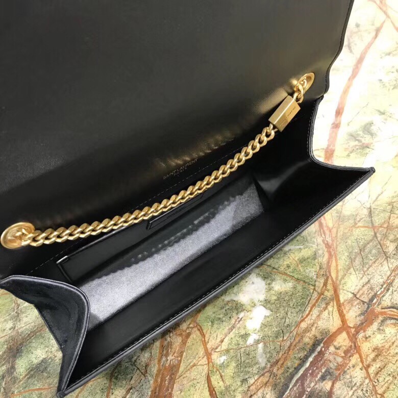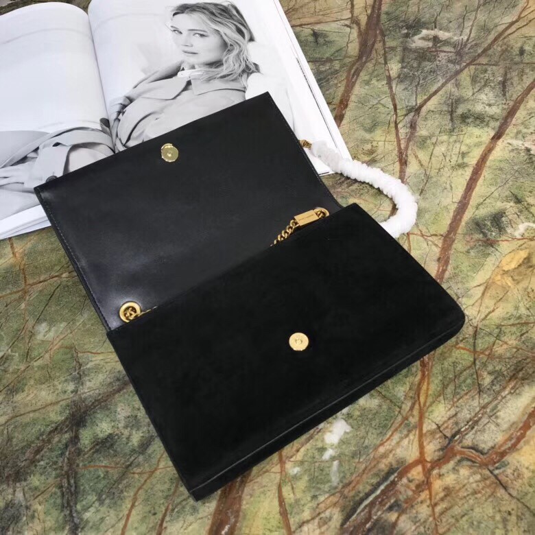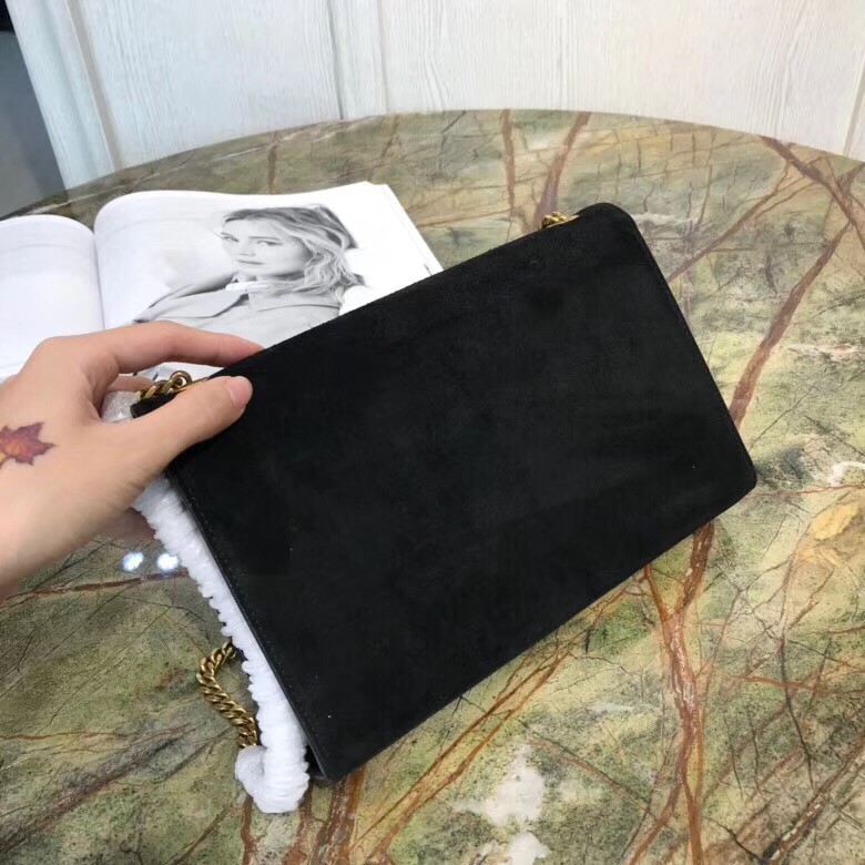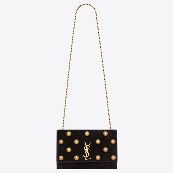 Saint Laurent’s Monogram Kate medium chain bag is crafted of suede leather and finished with studs . This elegant flap style features the initials of house founder Yves Saint Laurent in a logo designed for the brand by the artist Cassandre in 1961.