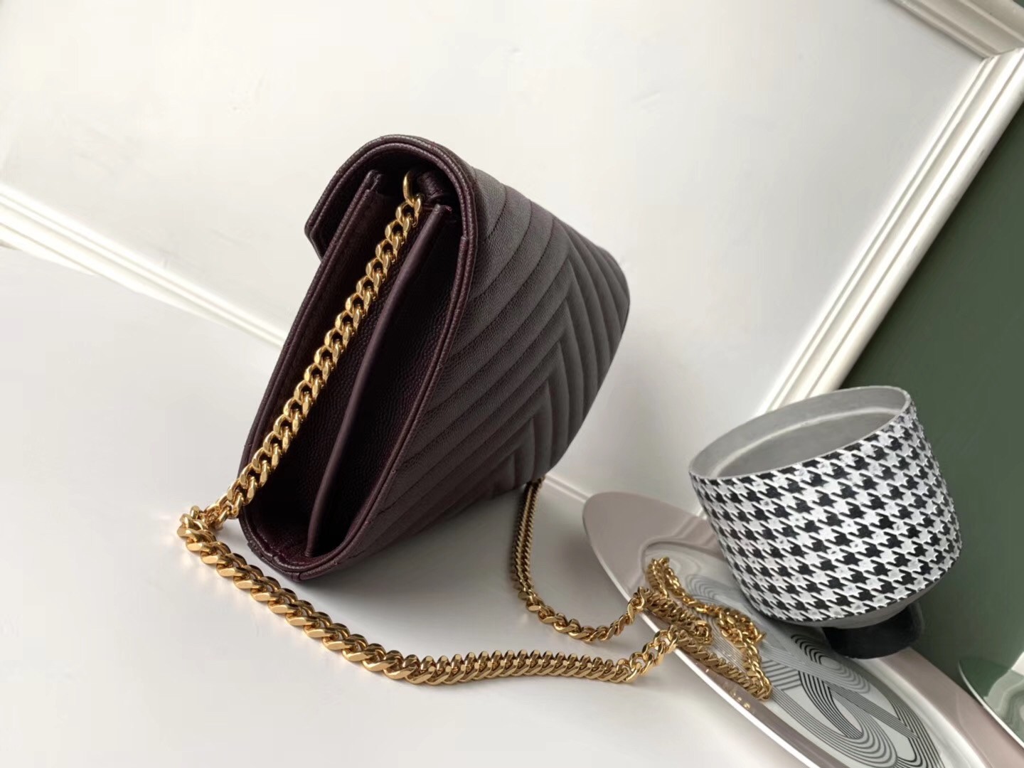 – Gold-toned hardware